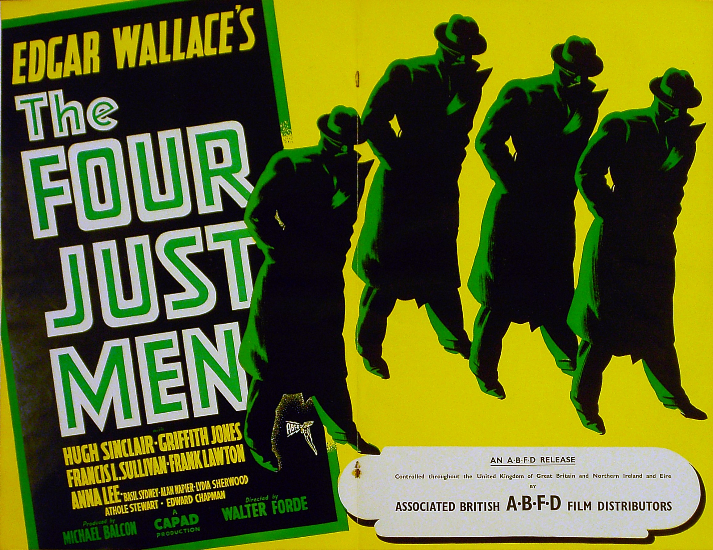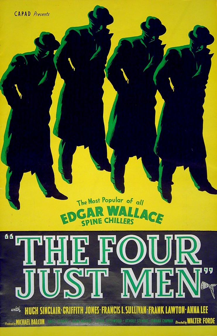 Original British 11 inch x 17 inch 8 page Illustrated Brochure with centre double page poster for the 1939 Walter Forde Ealing Studios Thriller THE FOUR JUST MEN, based on the novel by Edgar Wallace and starring Hugh Sinclair, Griffith Jones, Francis L. Sullivan, Frank Lawton, Anna Lee, Basil Sydney, Alan Napier, Lydia Sherwood, Athole Stewart and Edward Chapman.