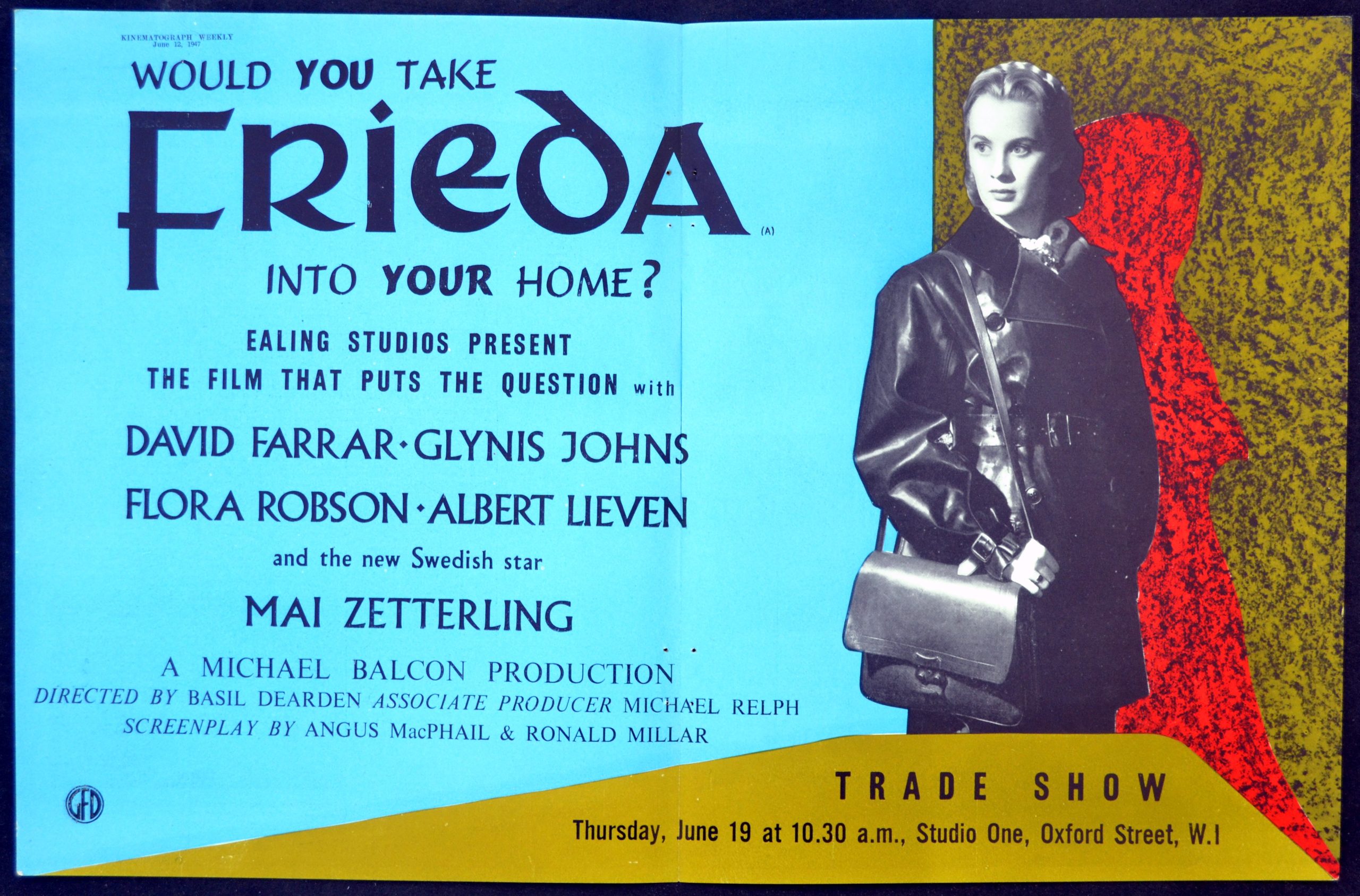 Original British 11 inch x 17 inch Trade Advertisement from Kinematograph Weekly for the 1947 Basil Dearden Ealing Studios Drama FRIEDA starring Mai Zetterling, David Farrar, Flora Robson, Glynis Johns, Albert Lieven, Barbara Everest, Gladys Henson, Ray Jackson, Gerard Heinz and Arthur Howard.