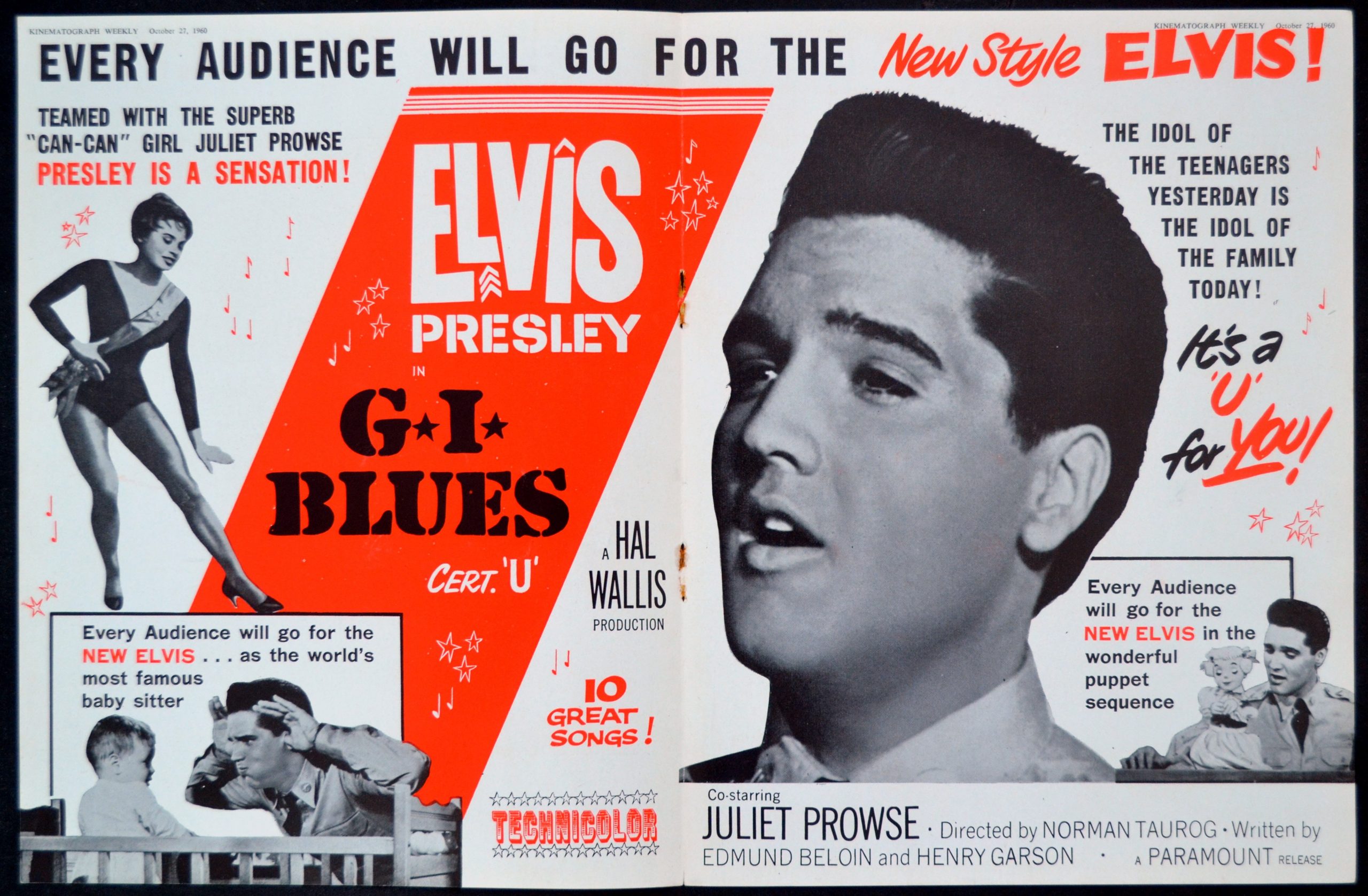 Original British 11 inch x 17 inch Trade Advertisement from Kinematograph Weekly for the 1960 Norman Taurog Musical G.I. BLUES starring Elvis Presley, Juliet Prowse, Robert Ivers, James Douglas and Letícia Román.
