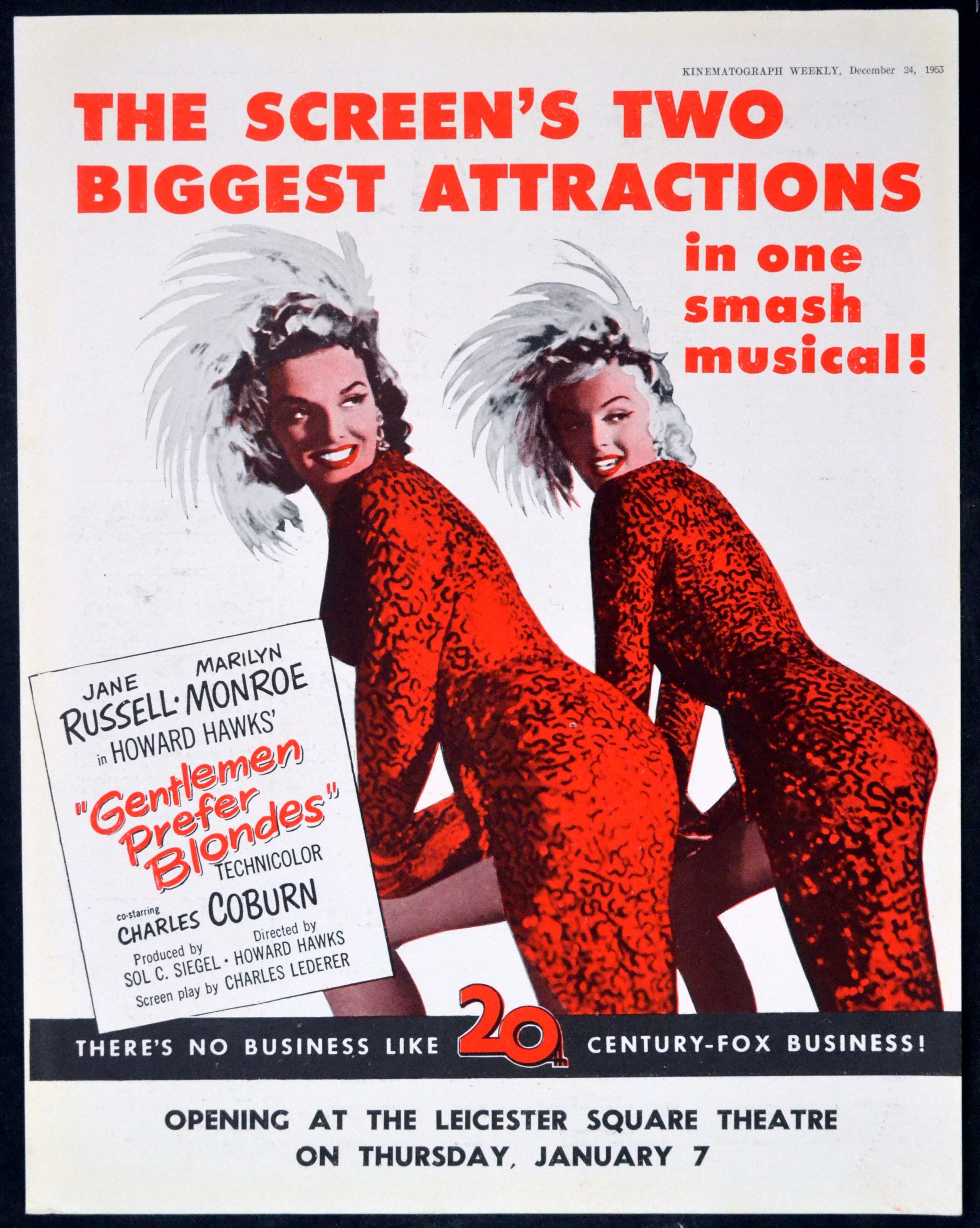 Original British 11 inch x 8 1/2 inch Trade Advertisement from Kinematograph Weekly for the 1953 Howard Hawks Musical Comedy GENTLEMEN PREFER BLONDES, based on the musical comedy by Joseph Fields and starring Marilyn Monroe, Jane Russell, Charles Coburn, Elliot Reid, Tommy Noonan, George Winslow, Marcel Dalio, Taylor Holmes, Norma Varden, Howard Wendell and Steven Geray.