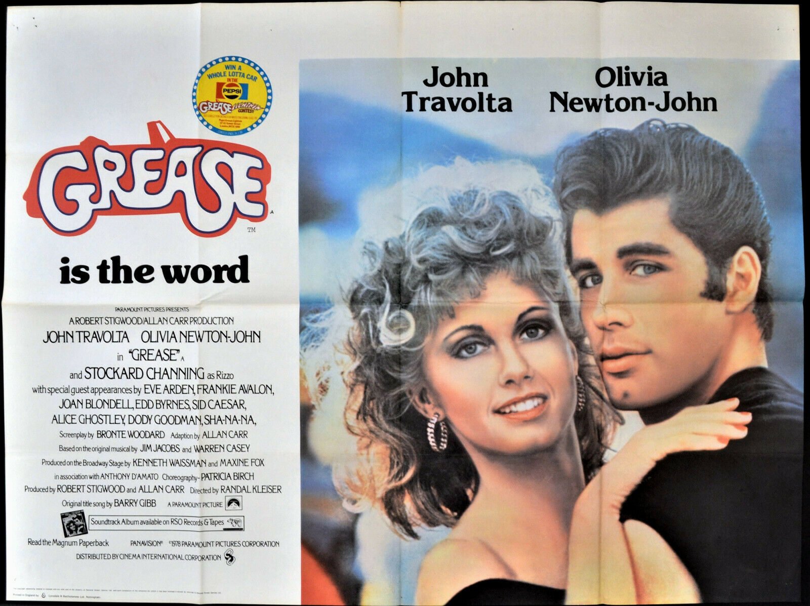 Original British 30 inch x 40 inch Quad Poster for the 1978 Randal Kleiser Rock ānā Roll Musical GREASE, based on the original musical by Jim Jacobs & Warren Casey and starring John Travolta, Olivia Newton-John, Stockard Channing, Eve Arden, Frankie Avalon), Joan Blondell, Edward Byrnes, Sid Caesar, Alice Ghostley, Dody Goodman, Sha-Na-Na, Jeff Conaway, Barry Pearl, Michael Tucci, Kelly Ward, Didi Conn, Susan Buckner, Eddie Deezen and Annette Charles.