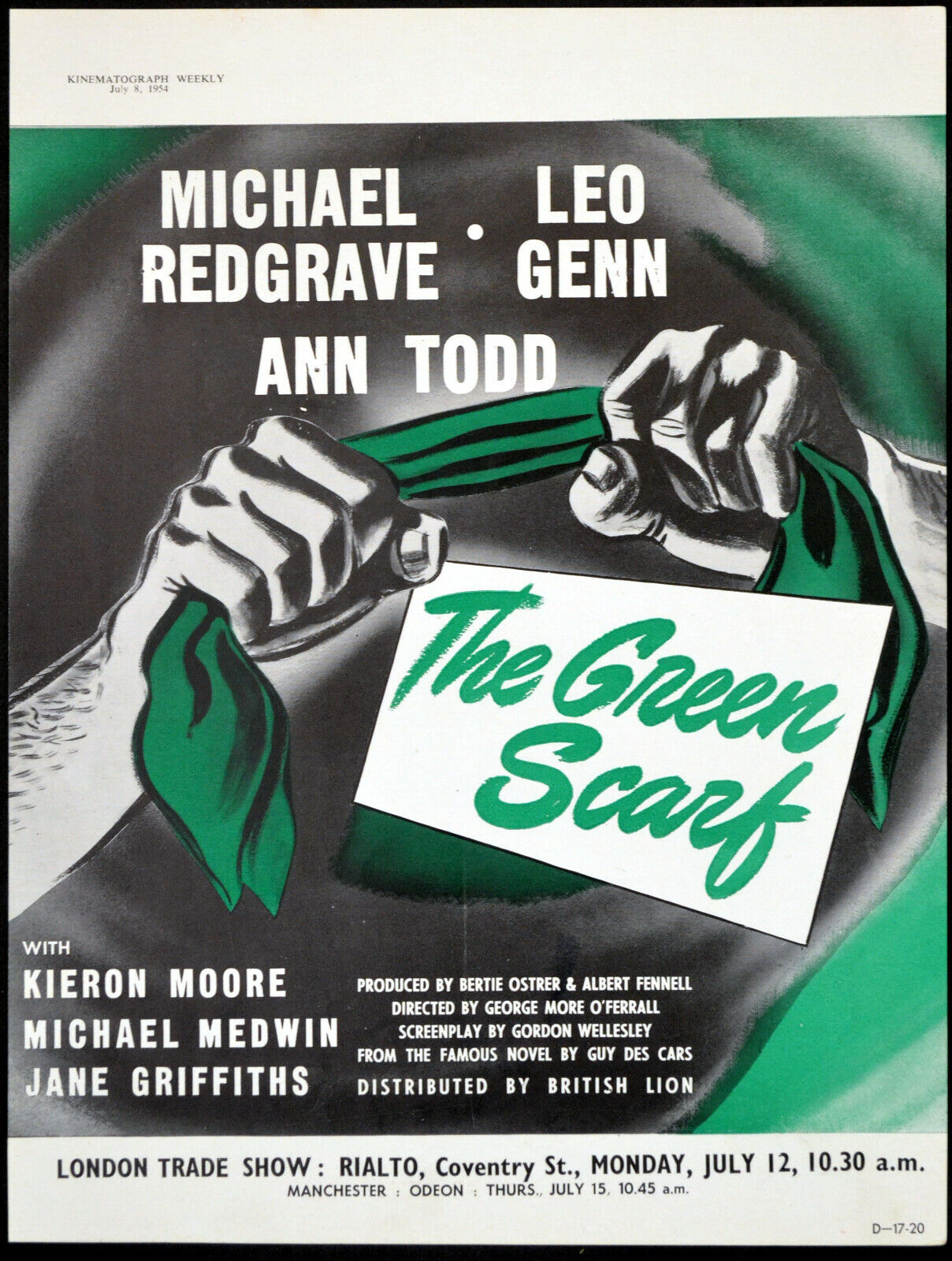 Original British 11 inch x 8 3/8 inch Trade Advertisement from Kinematograph Weekly for the 1954 George More O’Ferrall Thriller THE GREEN SCARF, based on the novel by novel by Guy de Cars and starring Michael Redgrave, Leo Genn, Ann Todd, Kieron Moore, Richard O’Sullivan, Michael Medwin, Jane Griffiths, George Merritt, Terence Alexander and Wilfrid Brambell.