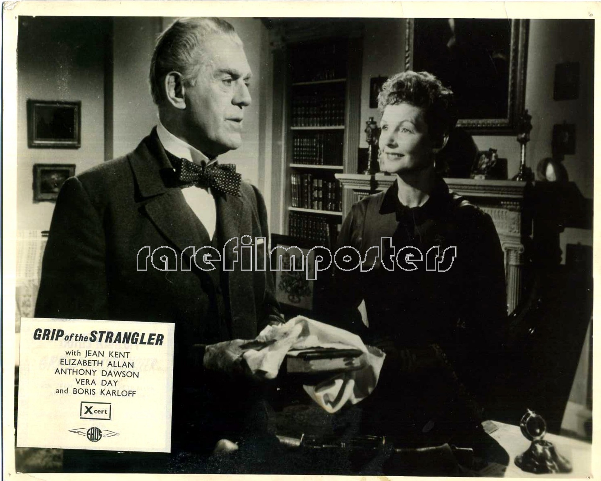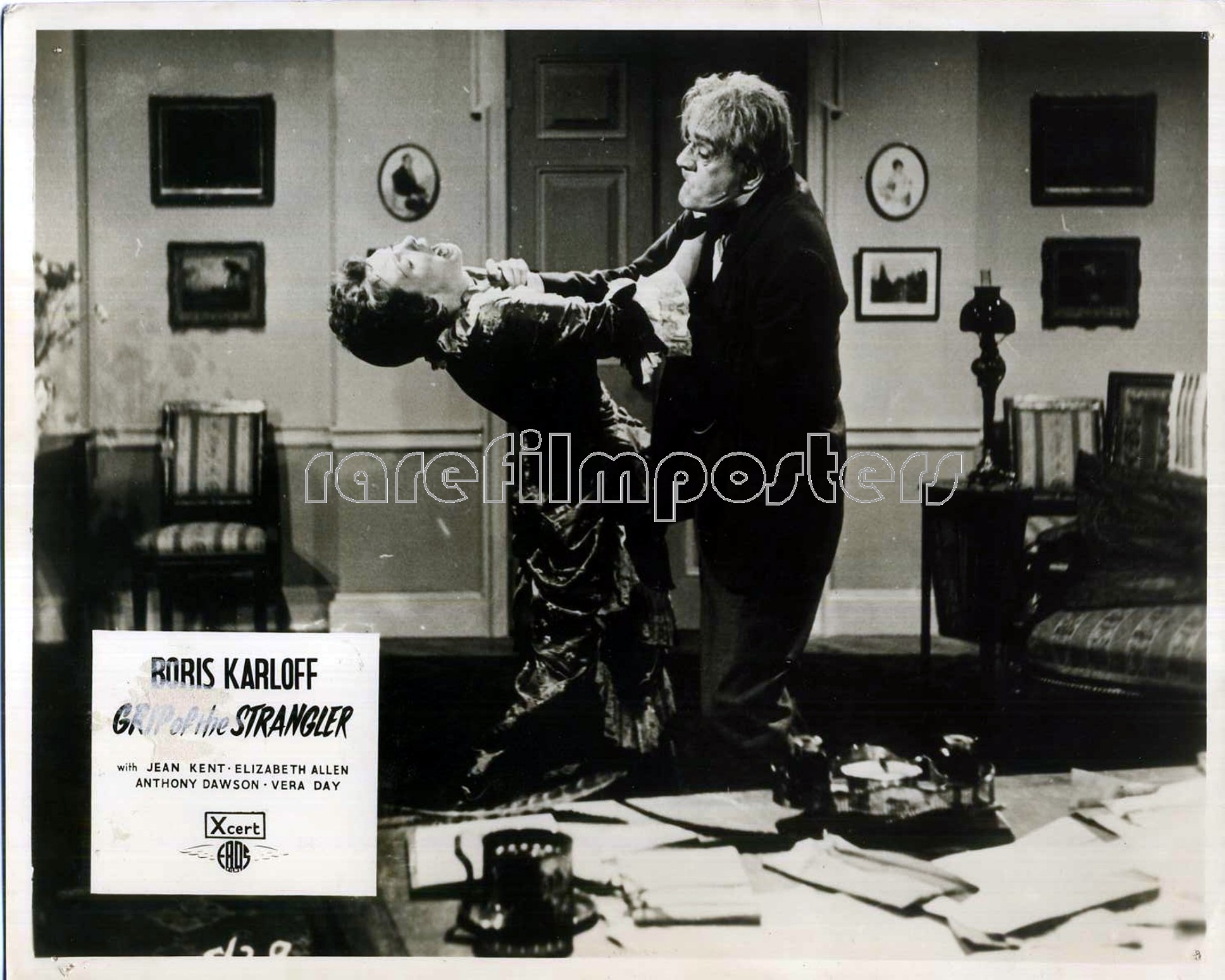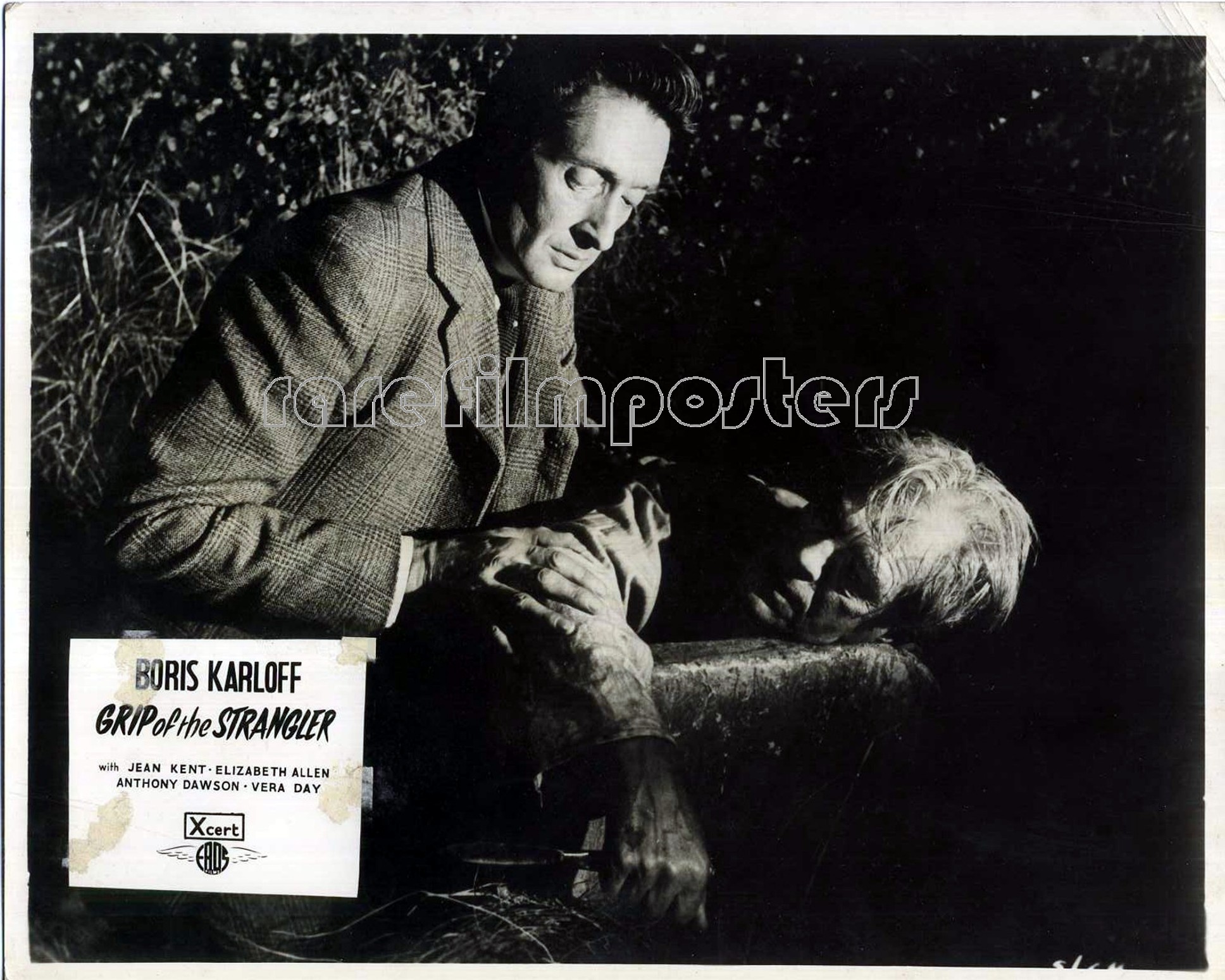 3 Original British 10 inch by 8 inch Front-of-House Stills (Lobby Cards) for the 1958 Robert Day Horror Movie GRIP OF THE STRANGLER, based on the story “Stranglehold” by Jan Read and starring Boris Karloff, Anthony Dawson and Elizabeth Allan