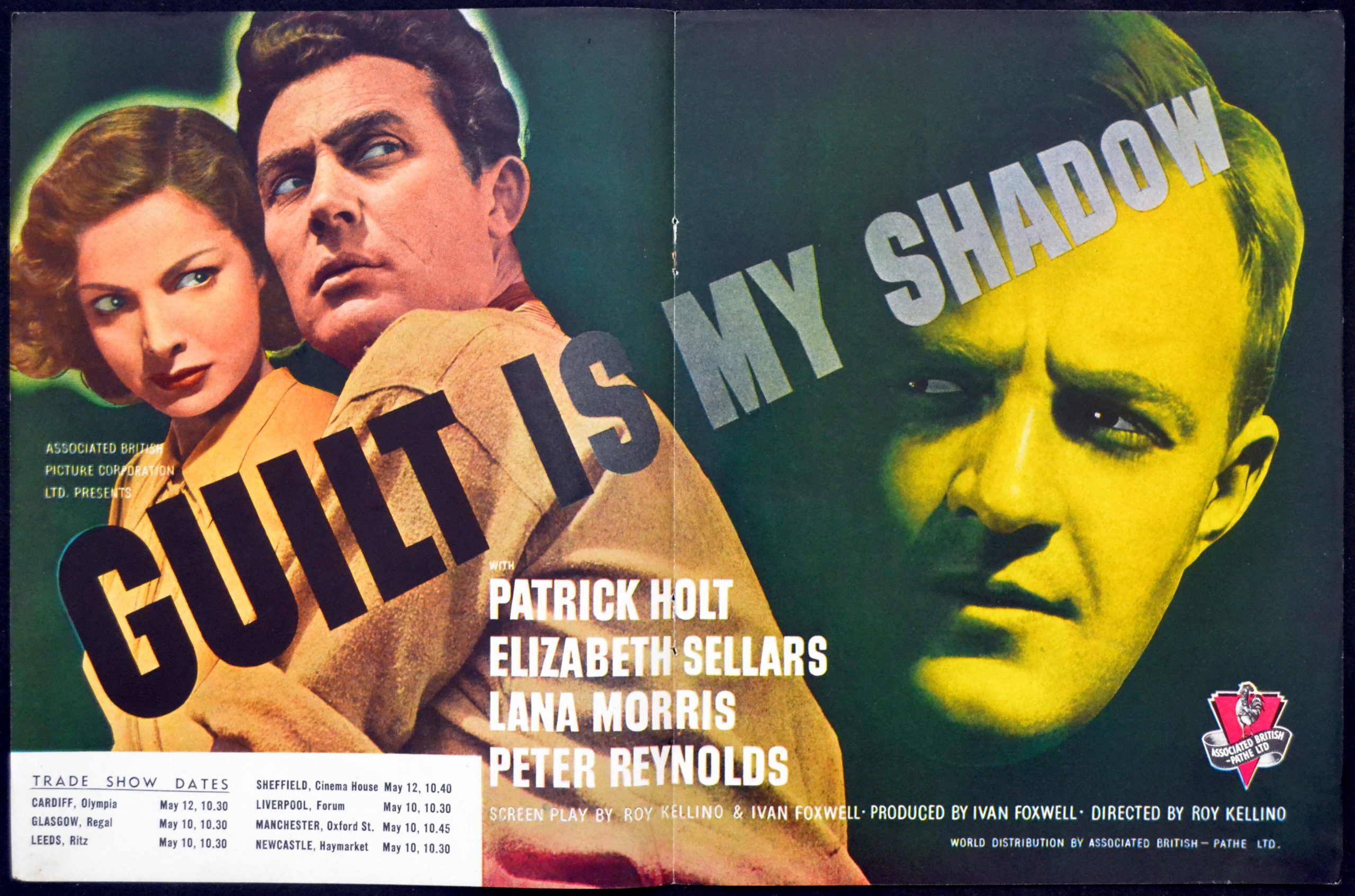 Original British 11 inch x 17 inch Double-Sided Trade Advertisement from Kinematograph Weekly for the 1950 Roy Kellino Crime Drama GUILT IS MY SHADOW, based on the novel “You’re Best Alone” by Norah Lofts and starring Peter Reynolds, Elizabeth Sellars, Lana Morris, Patrick Holt, Lawrence O’Madden, Esma Cannon, Wensley Pithey, Avice Landone, Aubrey Woods, Willoughby Gray and Desmond Llewelyn.