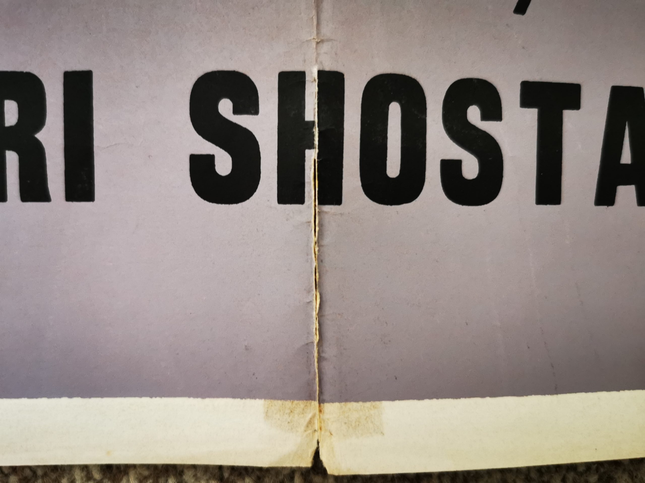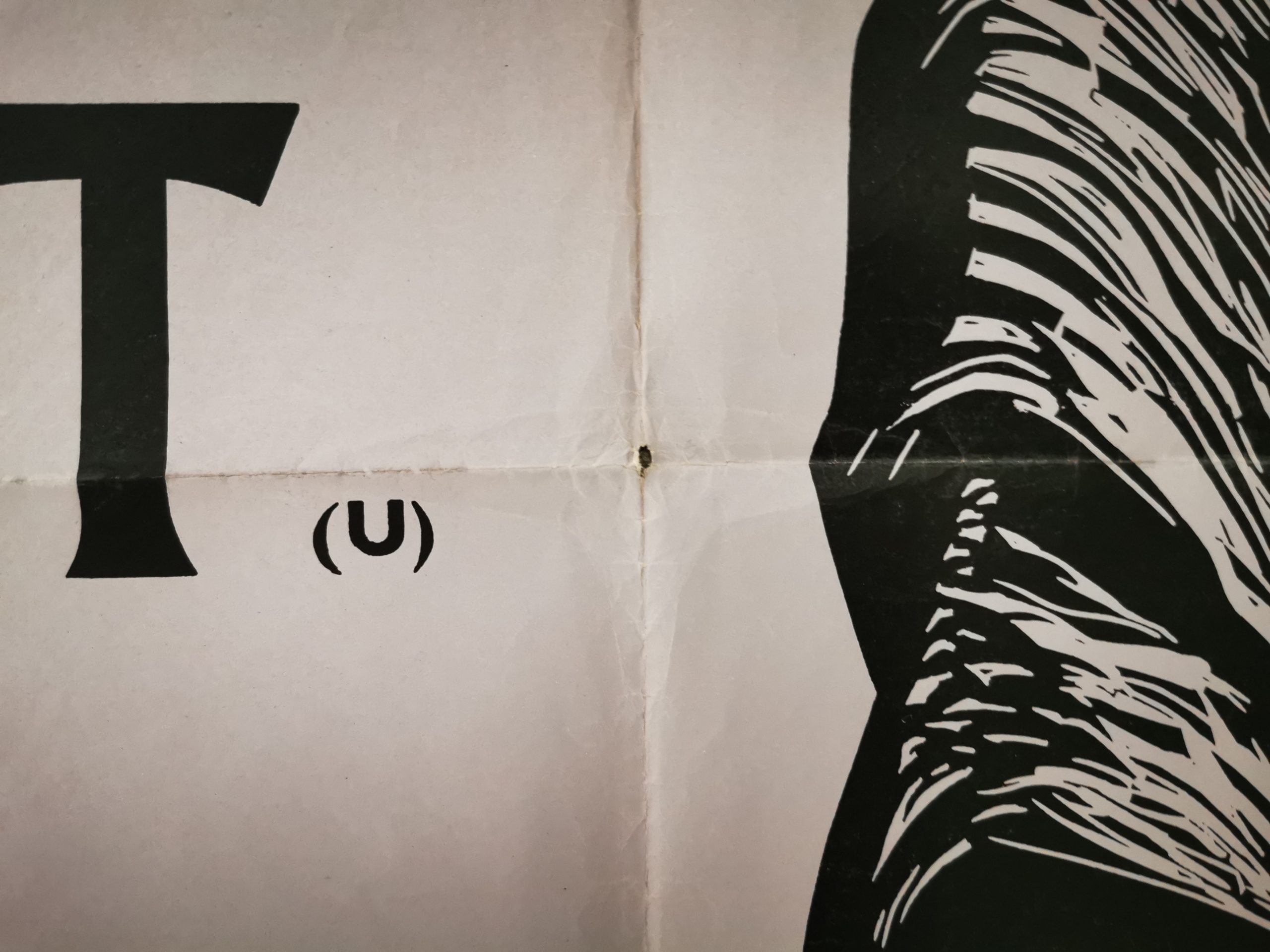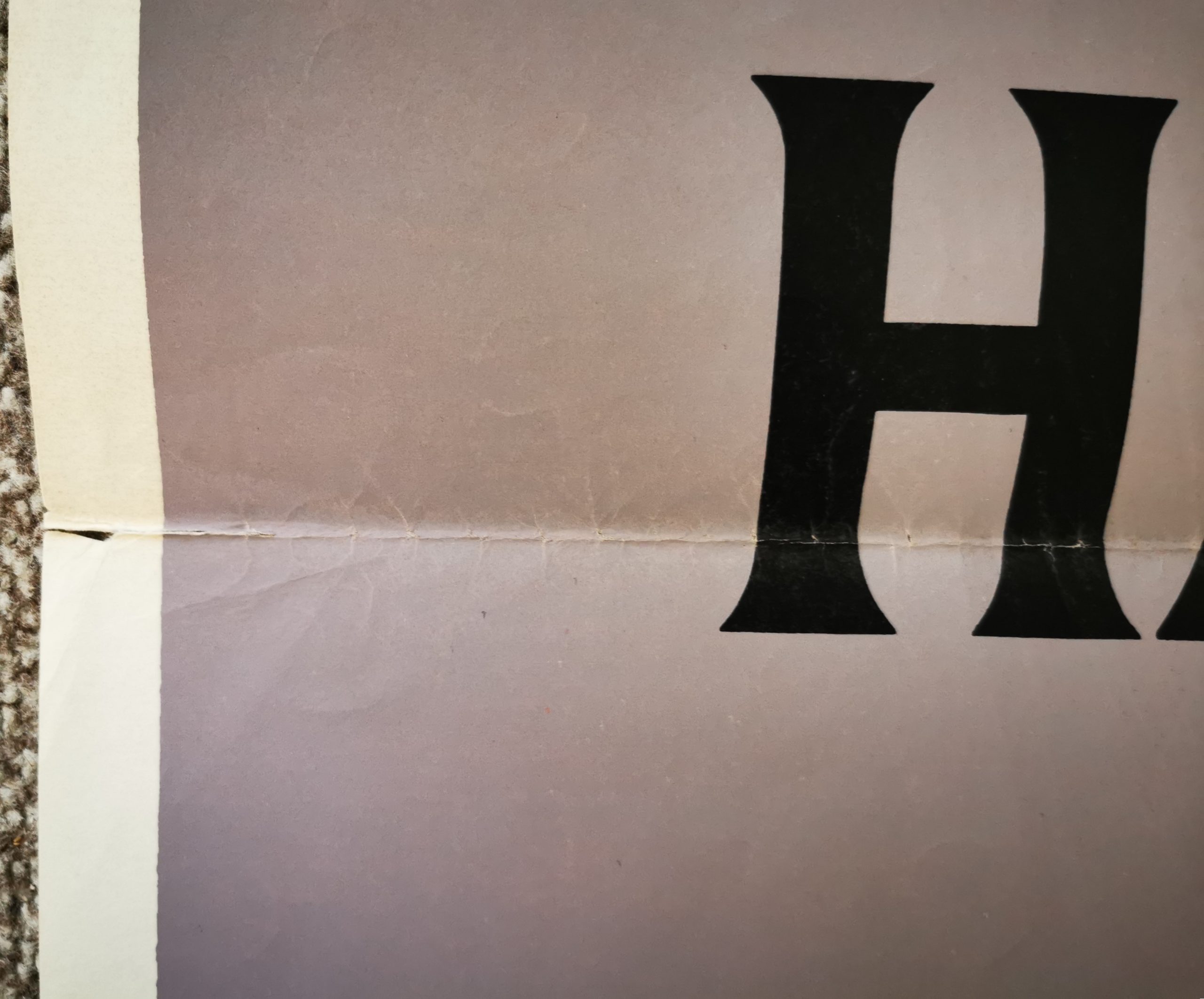 The poster, printed by Kent Art Printers is in very good folded condition. There is a 4 inch tear at the foot of the left vertical fold, which also has very minor wear,a short tear at the left end of the central horizontal fold and tiny holes at 2 of the cross folds.