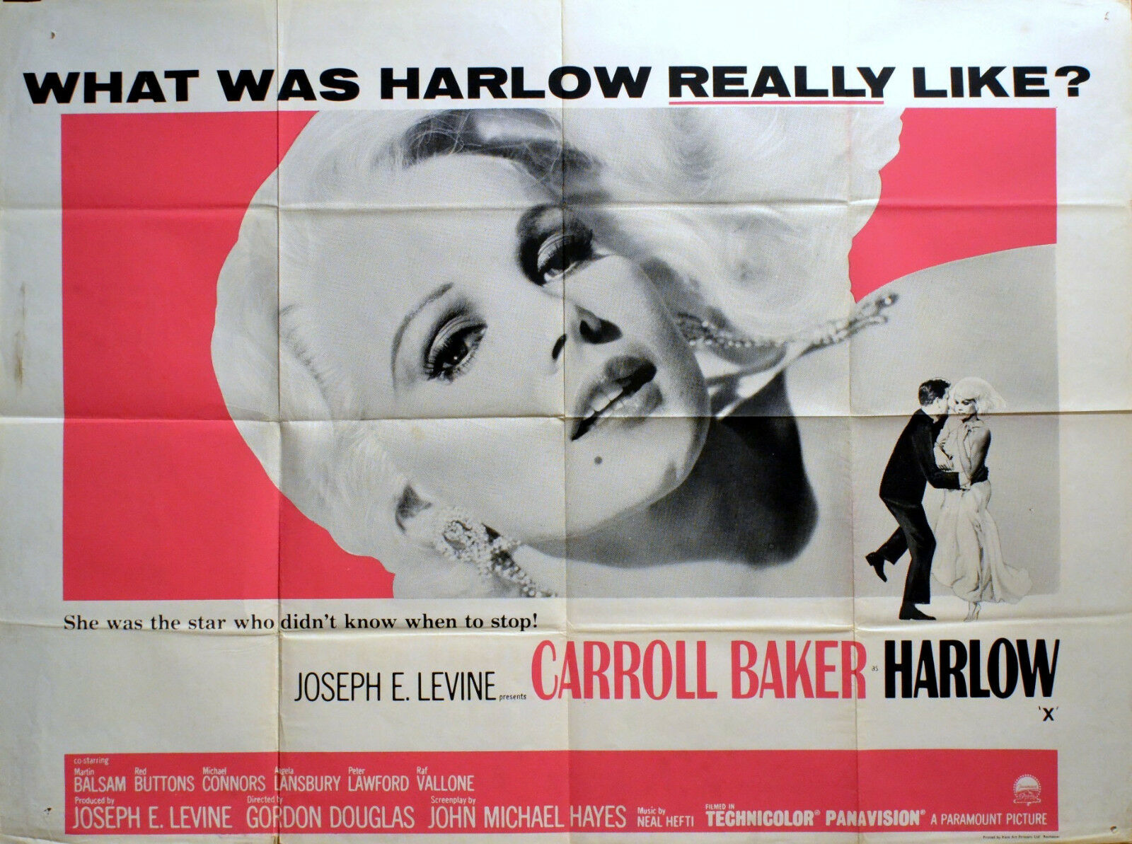 Original British 30 inch x 40 inch Quad Poster for the 1965 Alex Segal Drama HARLOW starring Carol Lynley, Efrem Zimbalist Jr., Ginger Rogers, Barry Sullivan, Hurd Hatfield, Lloyd Bochner, Hermione Baddeley, Audrey Totter, John Williams, Robert Strauss, Sonny Liston.