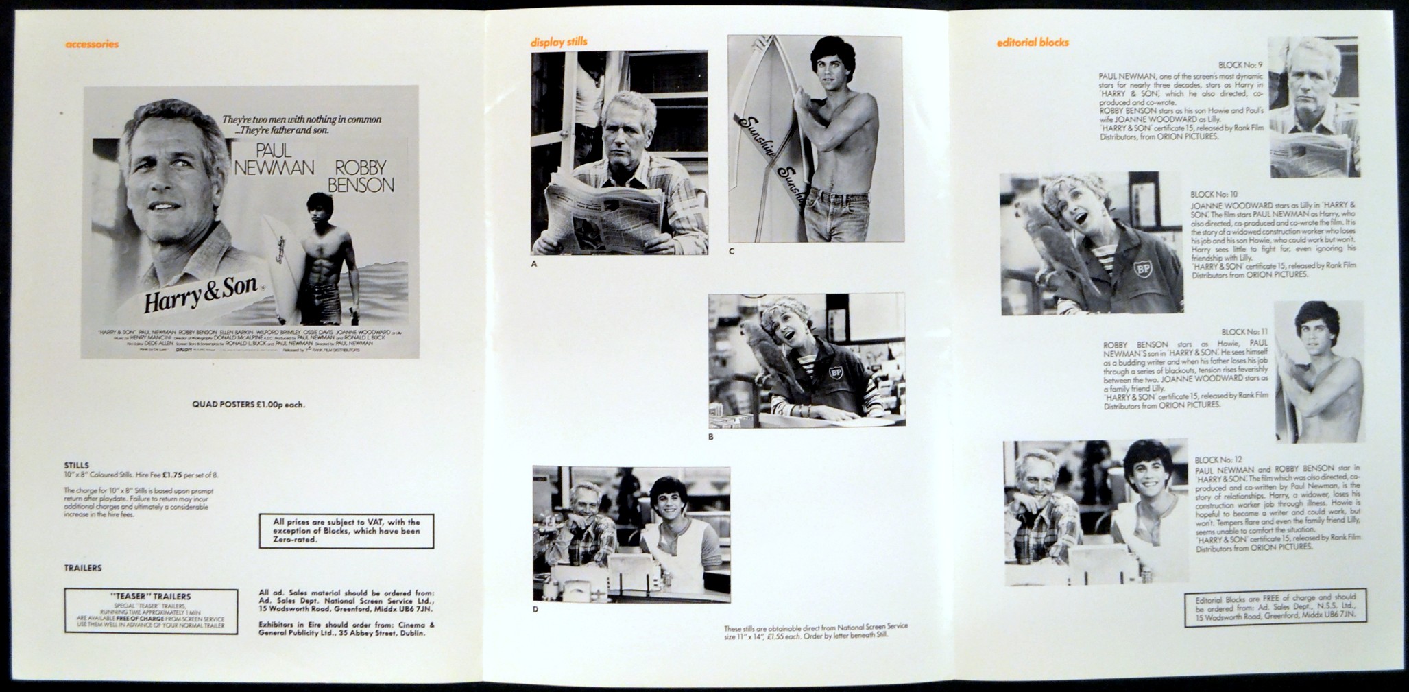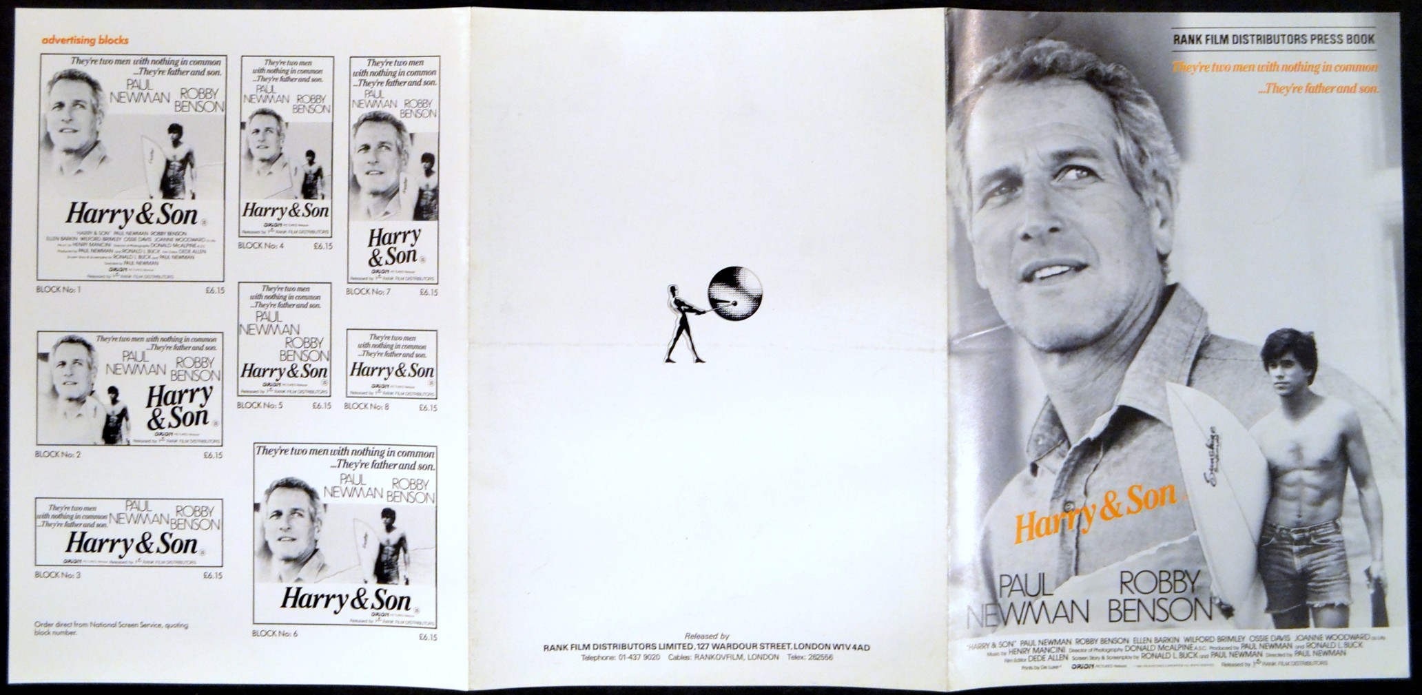 Original British 11 3/4 inch x 8 1/4 inch 6 Page illustrated Pressbook for the 1984 Paul Newman Drama HARRY AND SON starring Paul Newman, Robby Benson, Ellen Barkin, Wilford Brimley, Ossie Davis and Joanne Woodward.