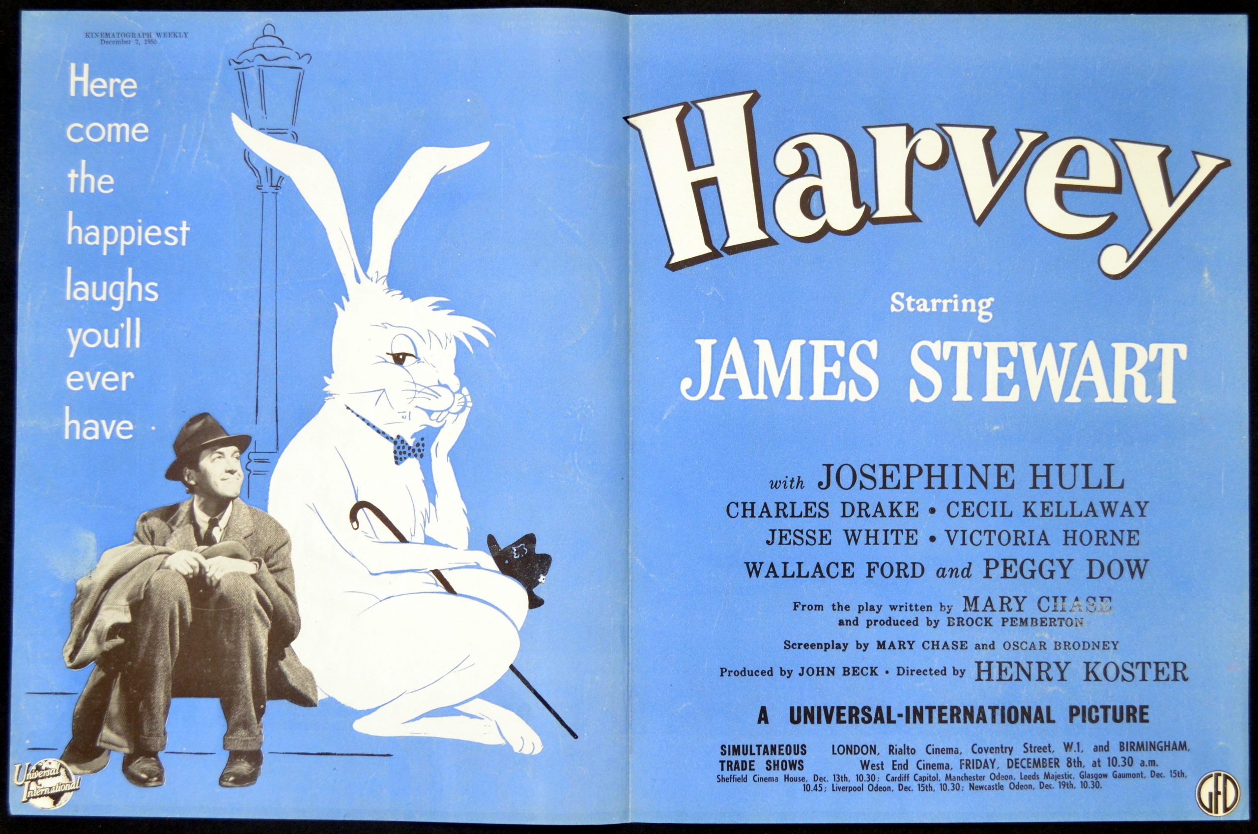 Original British 11 inch x 17 inch Trade Advertisement for the 1950 Henry Koster Fantasy Comedy HARVEY, based on the Pulitzer Prize Play by Mary Chase and starring James Stewart, Josephine Hull, Charles Drake, Peggy Dow, Jesse White, Cecil Kellaway, Clem Bevans, Wallace Ford, Don Brodie and Fess Parker.