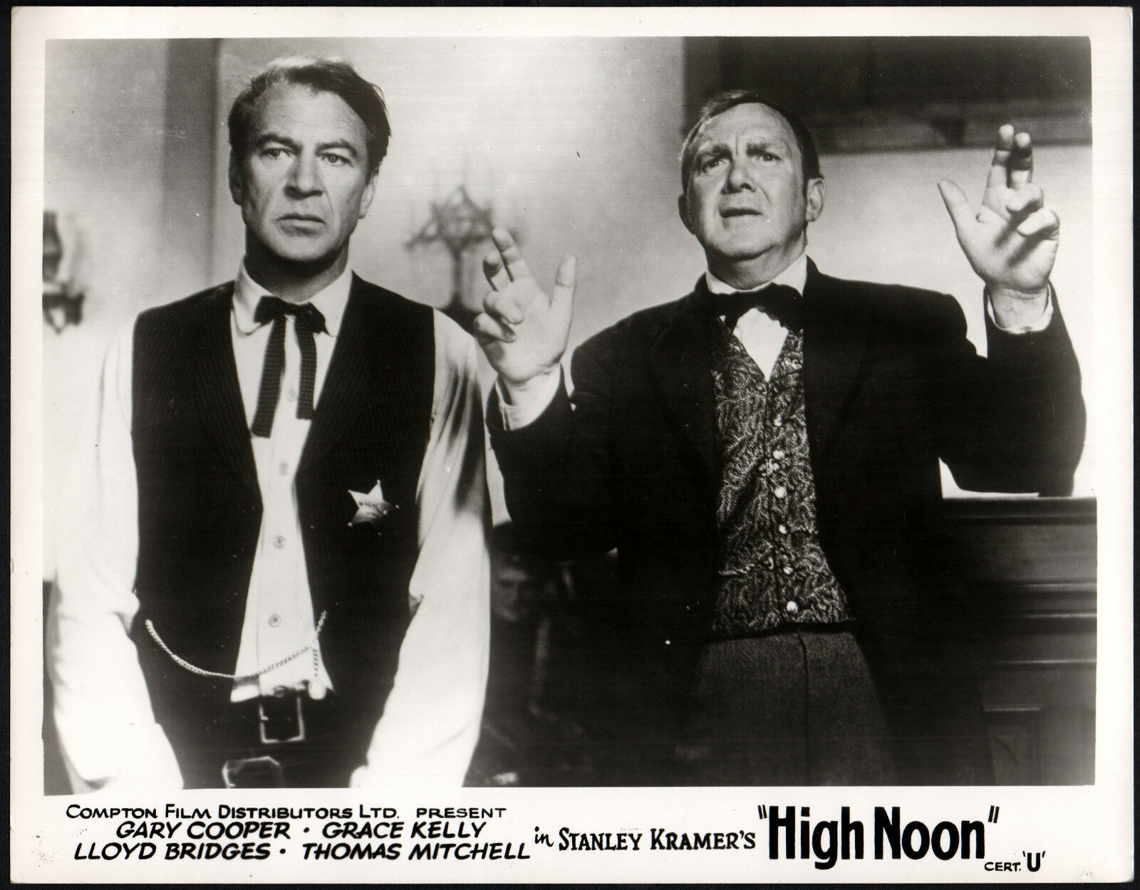 Original 1960s Compton Film Distributors Re-Release 10 inch x 8 inch Front-of-House Still (Lobby Card) of GARY COOPER & THOMAS MITCHELL in the 1952 Fred Zinnemann Classic Western HIGH NOON, based on the magazine story “The Tin Star” by John W. Cunningham.