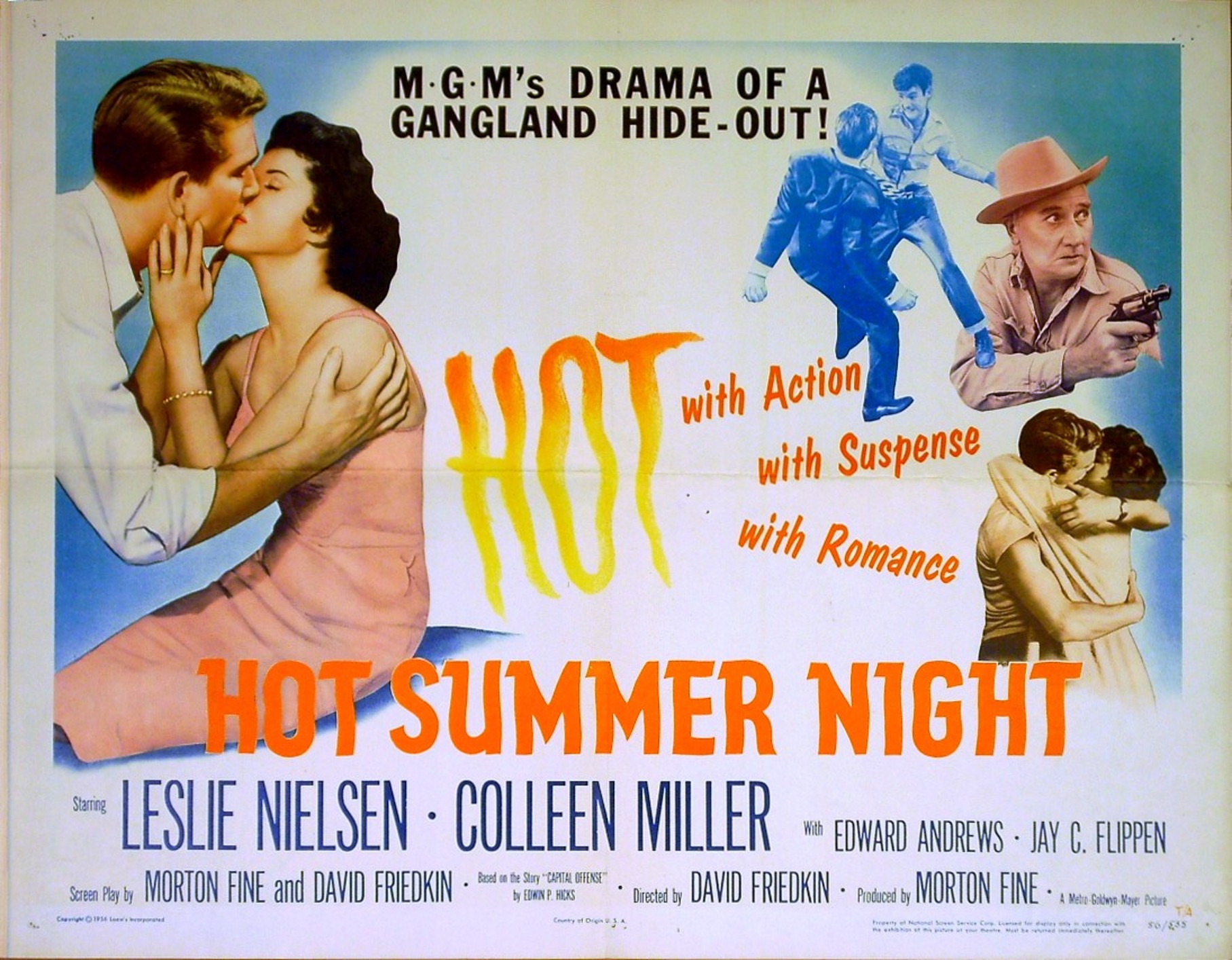 Original U.S. 22 inch x 28 inch Half Sheet Poster for the 1957 David Friedkin Crime Drama HOT SUMMER NIGHT starring Leslie Nielsen, Colleen Miller, Edward Andrews and Jay C. Flippen.