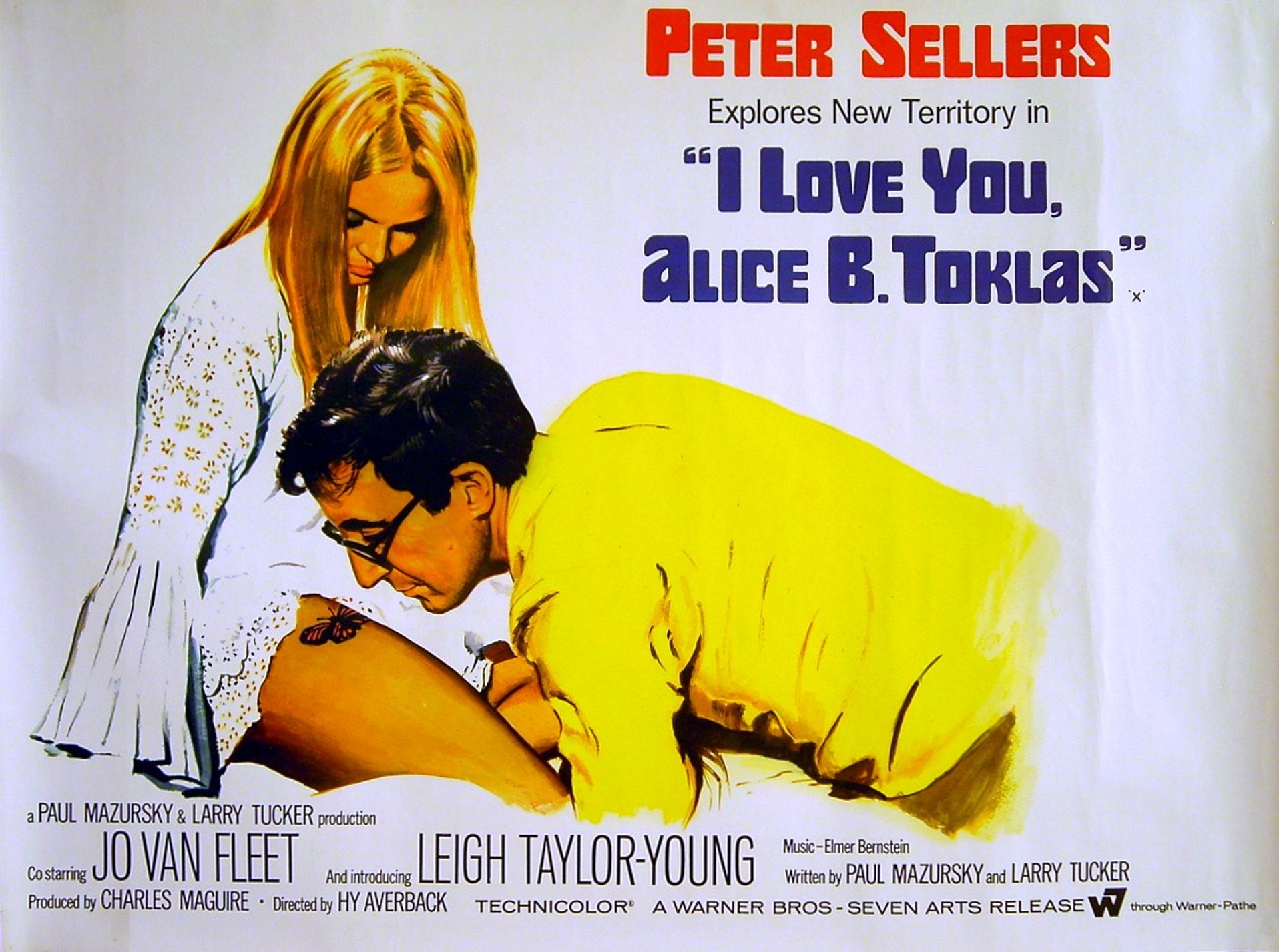Original British 30 inch x 40 inch Quad Poster for the 1968 Hy Averback Comedy I LOVE YOU, ALICE B. TOKLAS! starring Peter Sellers, Jo Van Fleet, Leigh Taylor-Young, Joyce Van Patten, David Arkin and Herb Edelman.