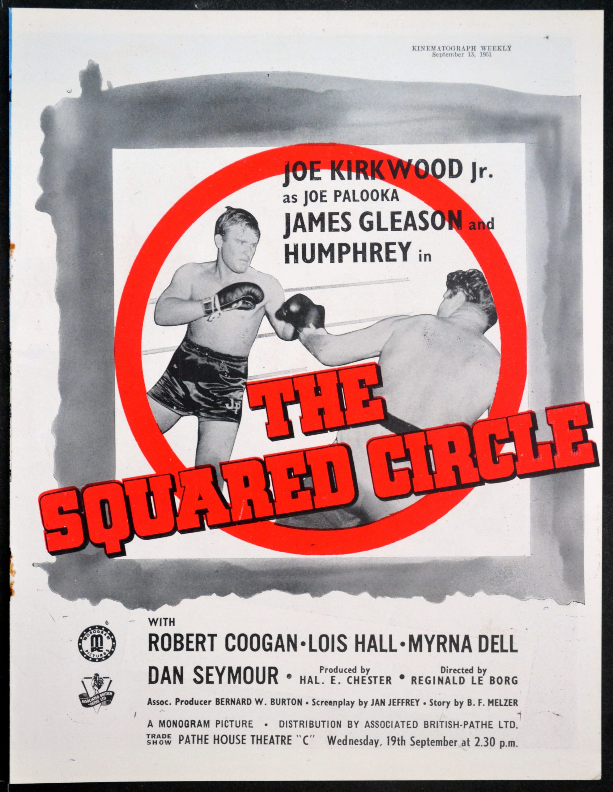 On the reverse is the 11 inch x 8 1/2 inch Trade Advertisement for the 1950 Reginald Le Borg Crime Comedy THE SQUARED CIRCLE starring Joe Kirkwood Jr., James Gleason, Lois Hall and Edgar Barrier.