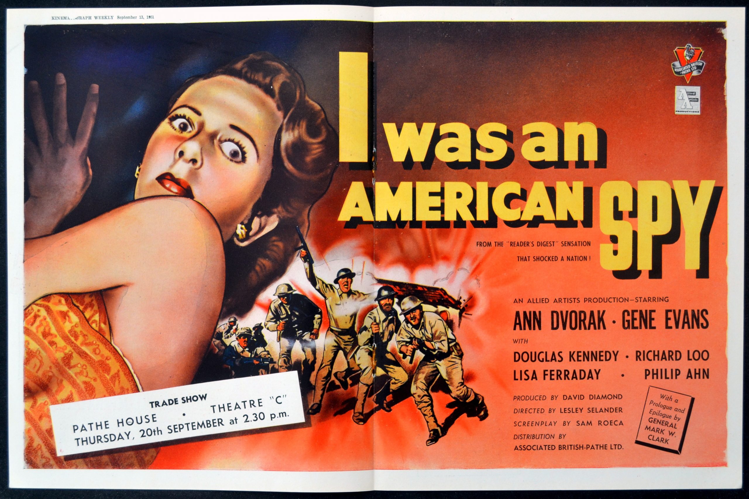 Original British 17 inch x 11 inch Double-Sided Trade Advertisement from Kinematograph Weekly for the 1951 Lesley Selander Drama I WAS AN AMERICAN SPY starring Ann Dvorak, Gene Evans, Douglas Kennedy, Richard Loo, Lisa Ferraday and Philip Ahn.
