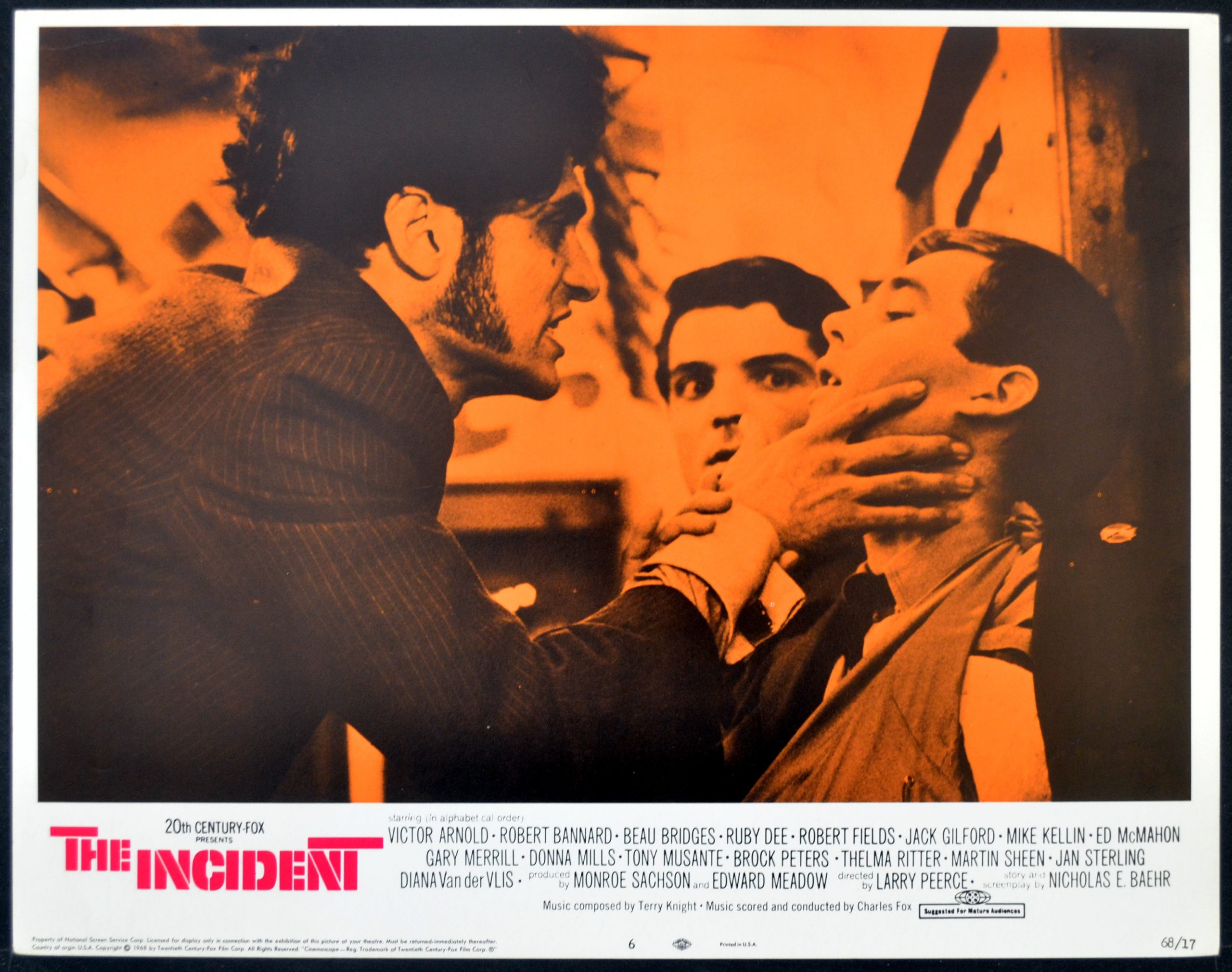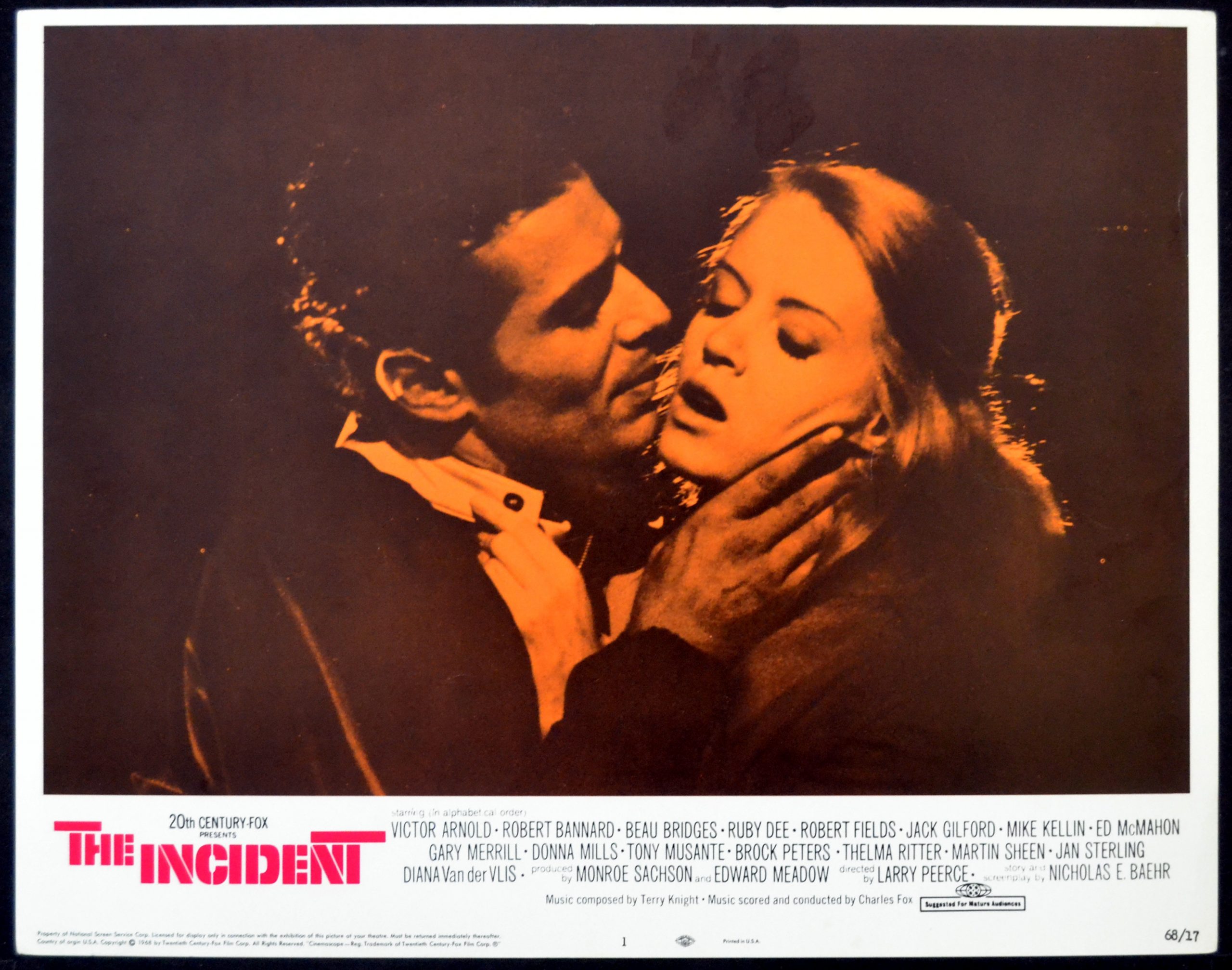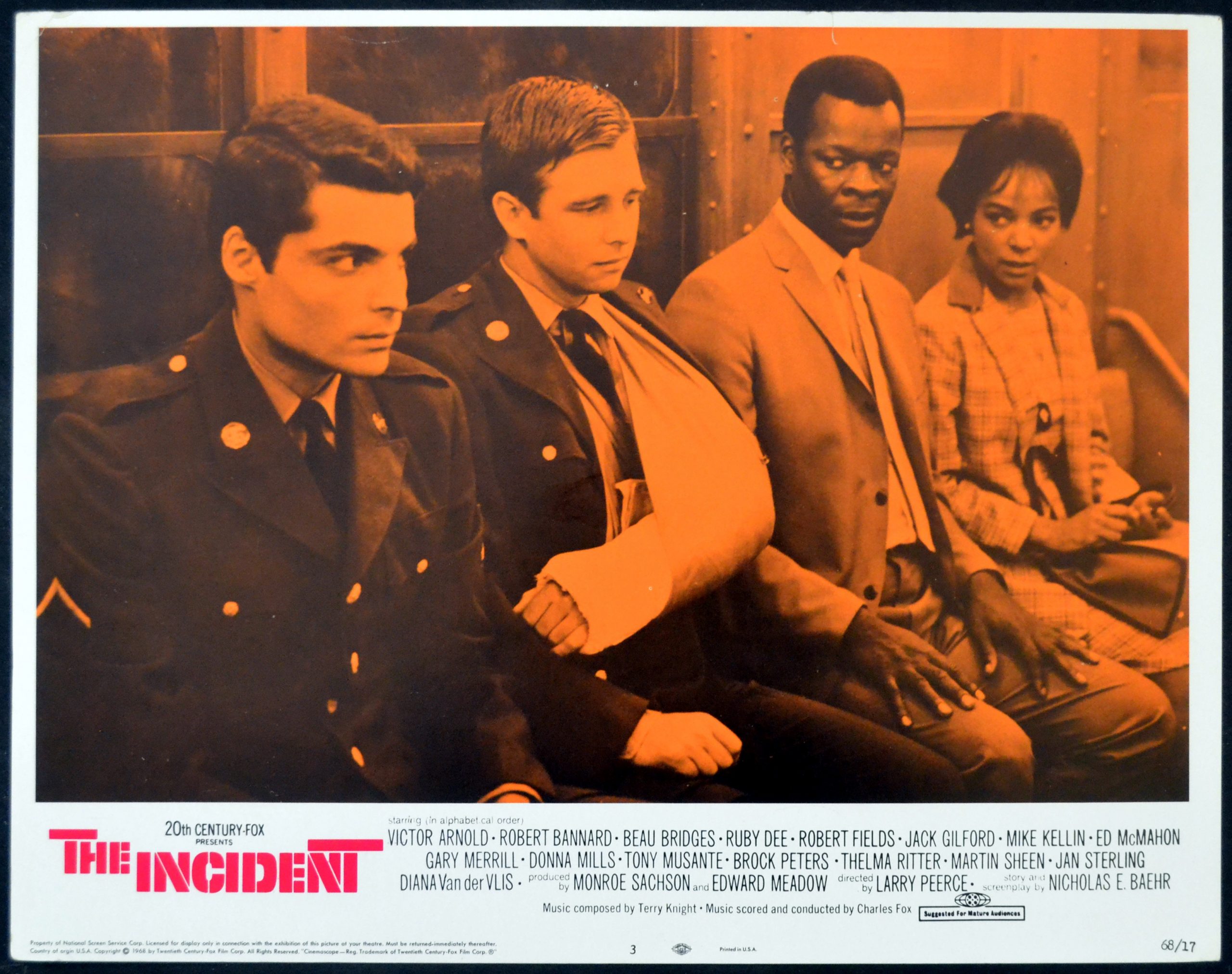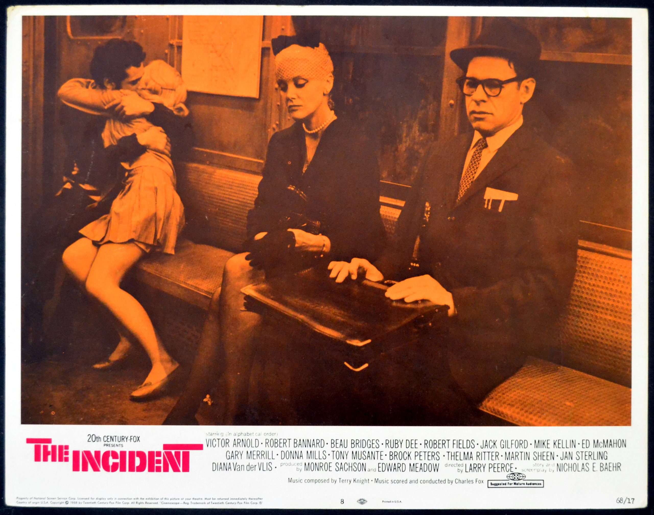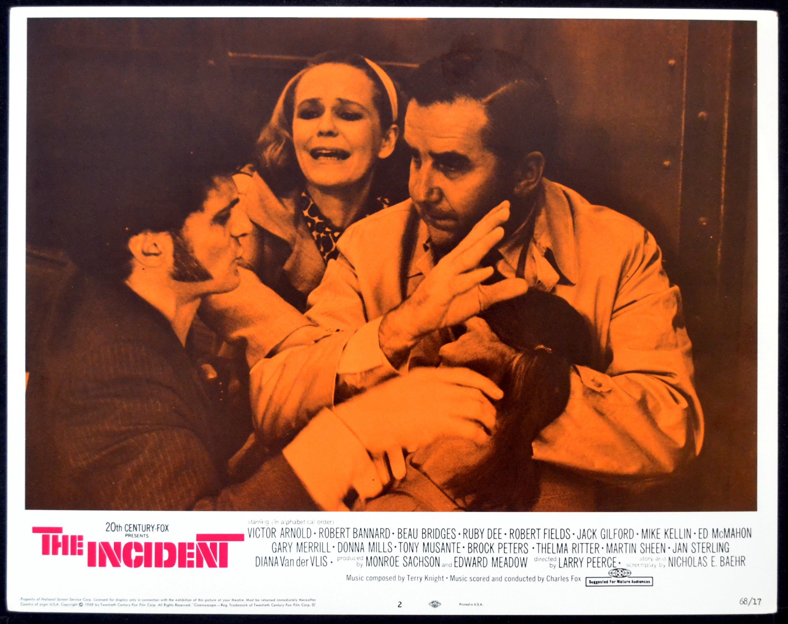 5 Original U.S. 11 inch x 14 inch Lobby Cards for the 1967 Larry Peerce Drama THE INCIDENT, story and screenplay by Nicholas E. Baehr and starring Tony Musante, Martin Sheen (in his first screen role), Beau Bridges, Brock Peters, Ruby Dee, Jack Gilford, Thelma Ritter, Ed McMahon, Diana Van der Vlis, Mike Kellin, Jan Sterling, Gary Merrill, Robert Fields, Robert Bannard, Victor Arnold, Donna Mills, Kathleen Smith and Henry Proach.