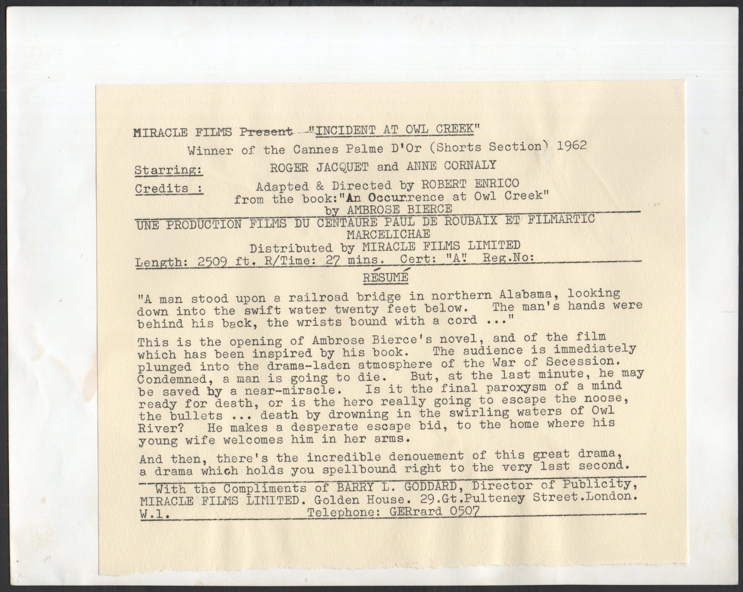 Original British 10 inch x 8 inch Still of ROGER JACQUET in the 1961 Robert Enrico Civil War Drama INCIDENT AT OWL CREEK, based on the book “An Occurrence at Owl Creek” by Ambrose Bierce.