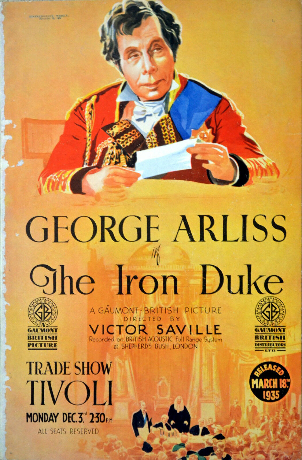 Original British 17 inch x 11 inch Trade Advertisement for the 1934 Victor Saville Biographical Drama THE IRON DUKE starring George Arliss as The Duke of Wellington, Ellaline Terriss, Gladys Cooper, A.E. Matthews, Alan Aynesworth as Louis XVIII, Lesley Wareing, Emlyn Williams, Felix Aylmer and Gibb McLaughlin.