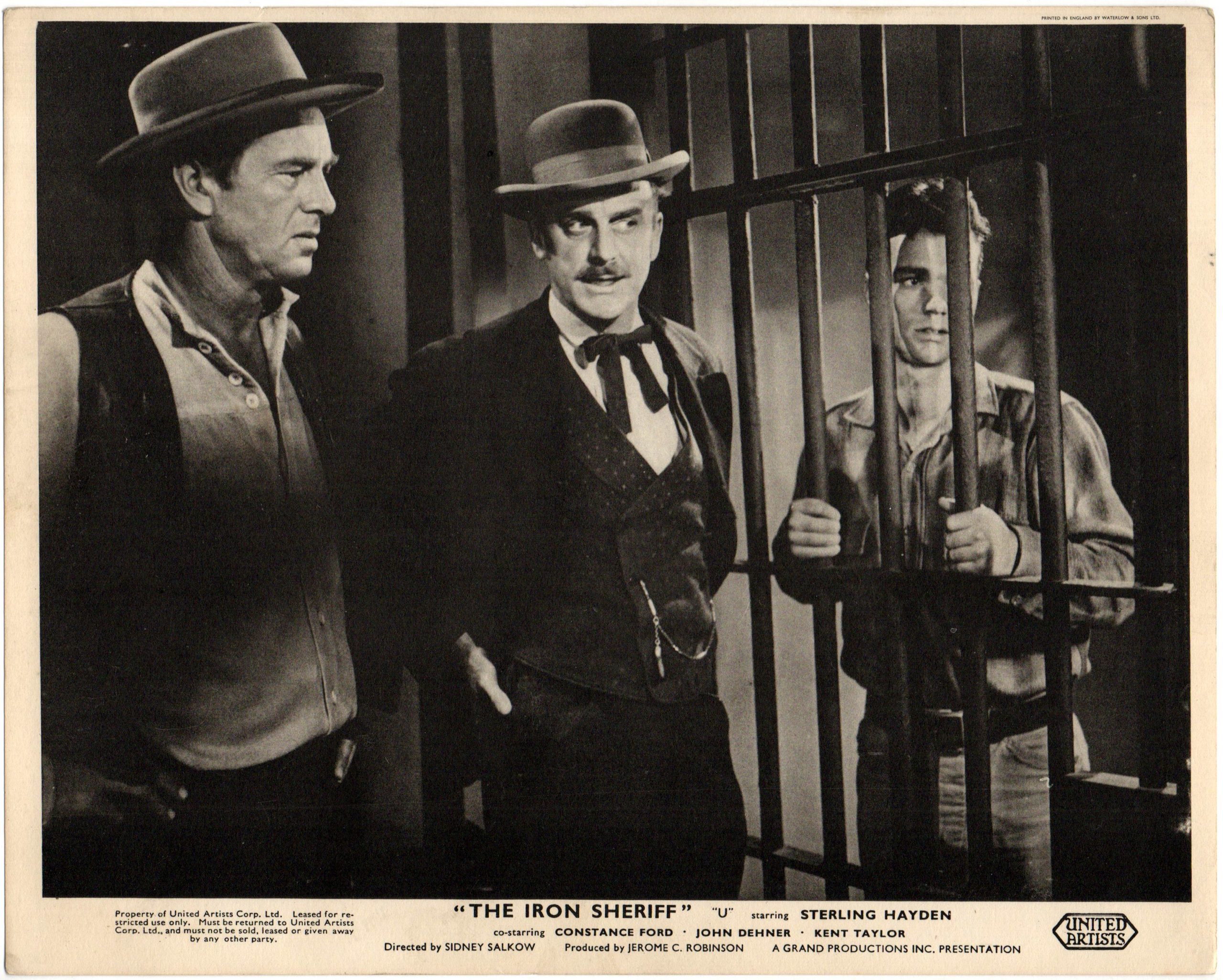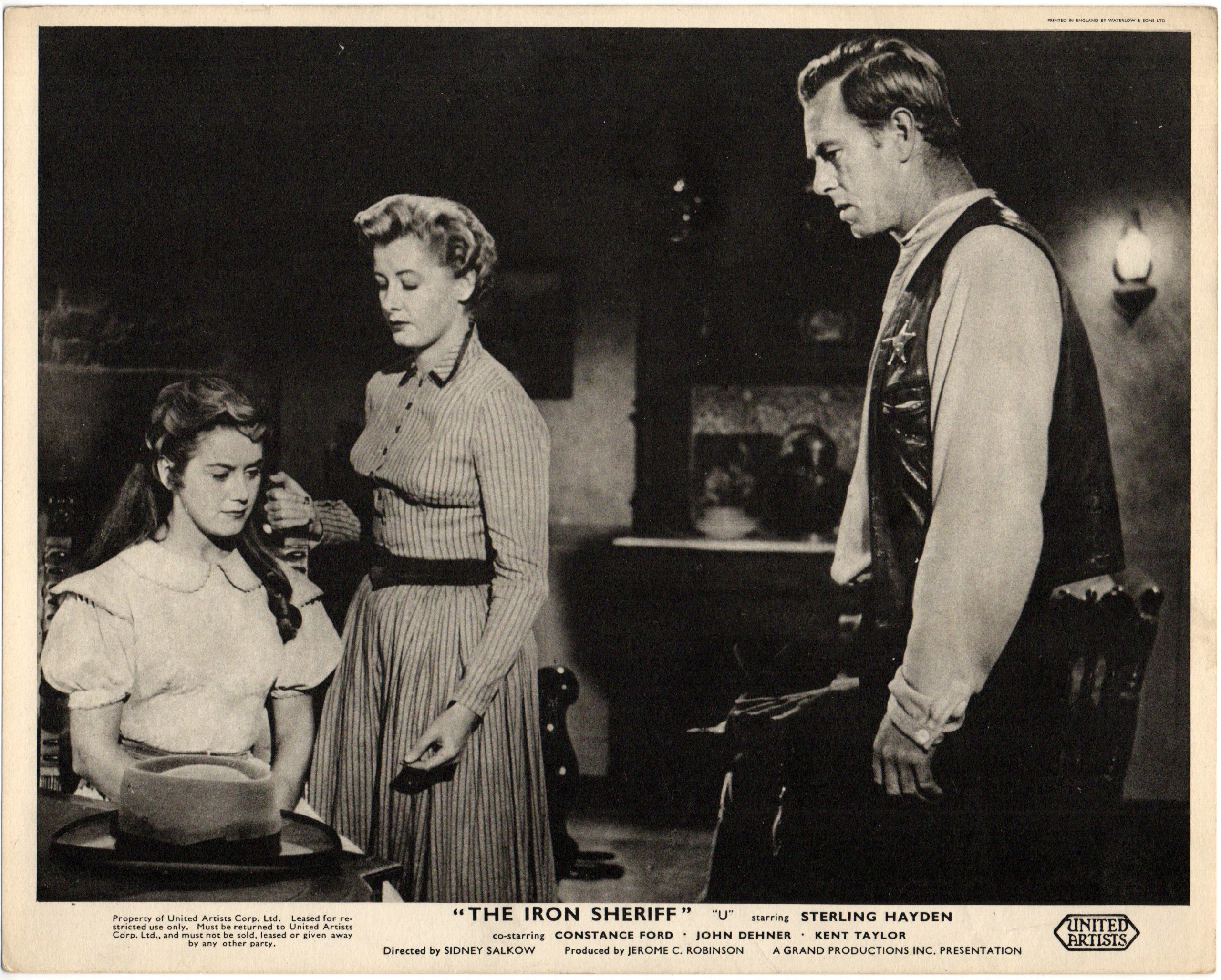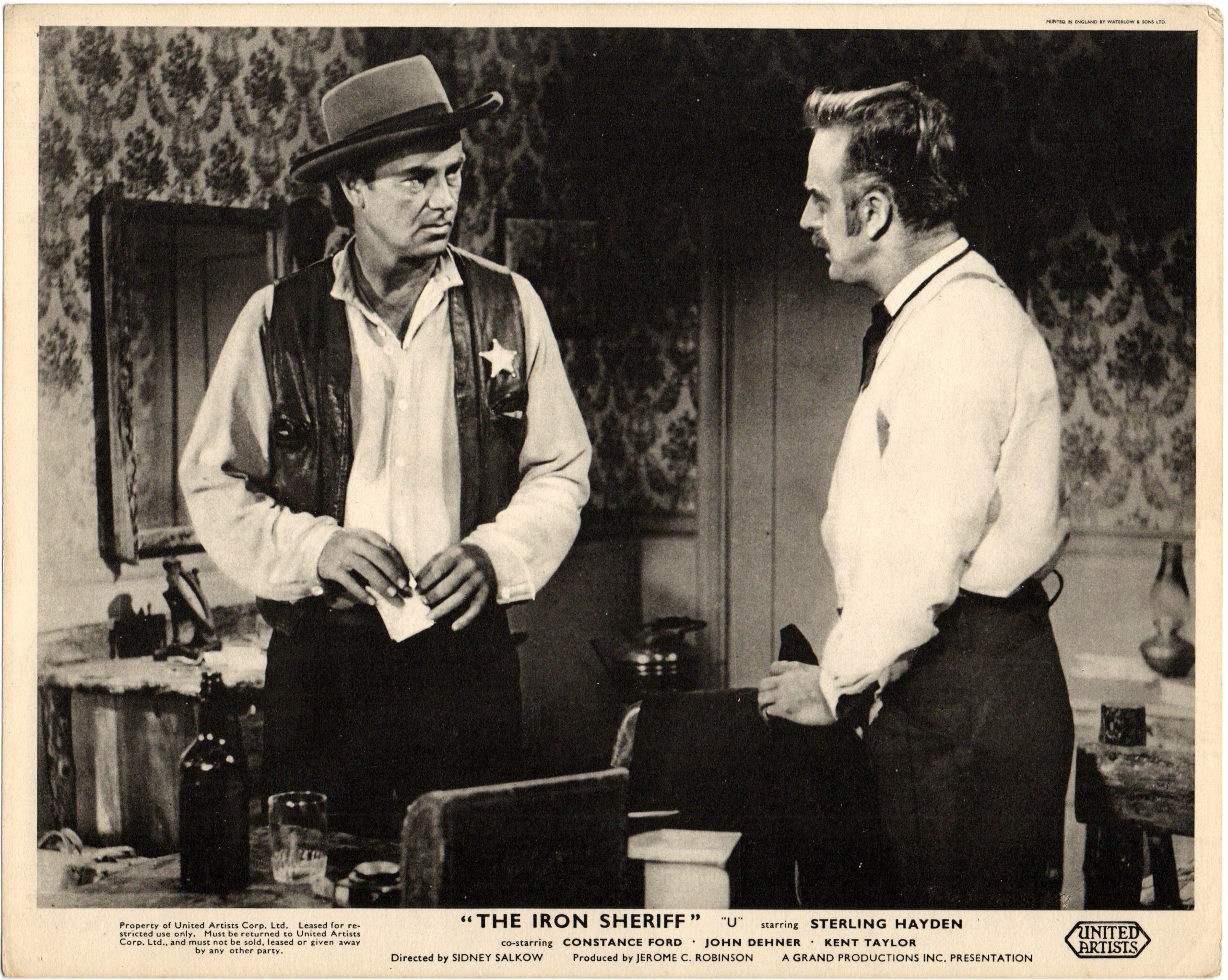 7 Original 10 inch x 8 inch Front-of-House Stills (Lobby Cards) for the 1957 Sidney Salkow Western THE IRON SHERIFF starring Sterling Hayden, Constance Ford, John Dehner, Kent Taylor, Darryl Hickman, Walter Sande, Frank Ferguson, King Donovan, Mort Mills and Peter Miller.