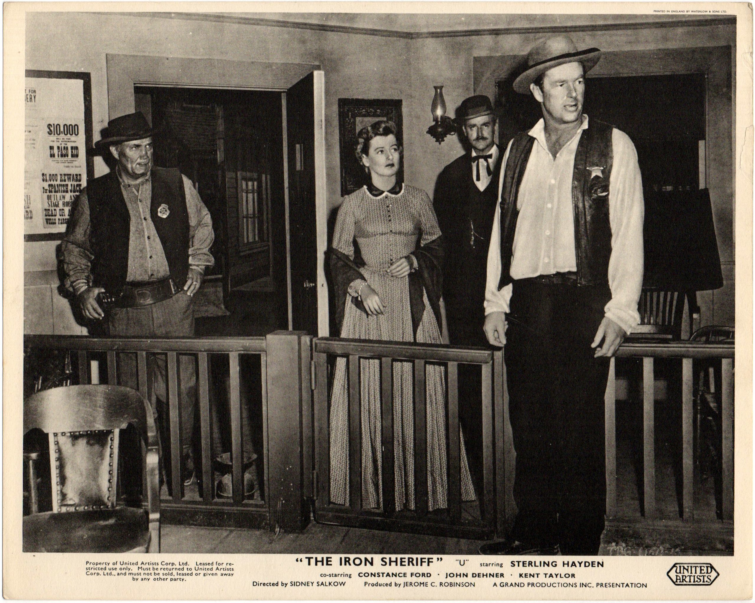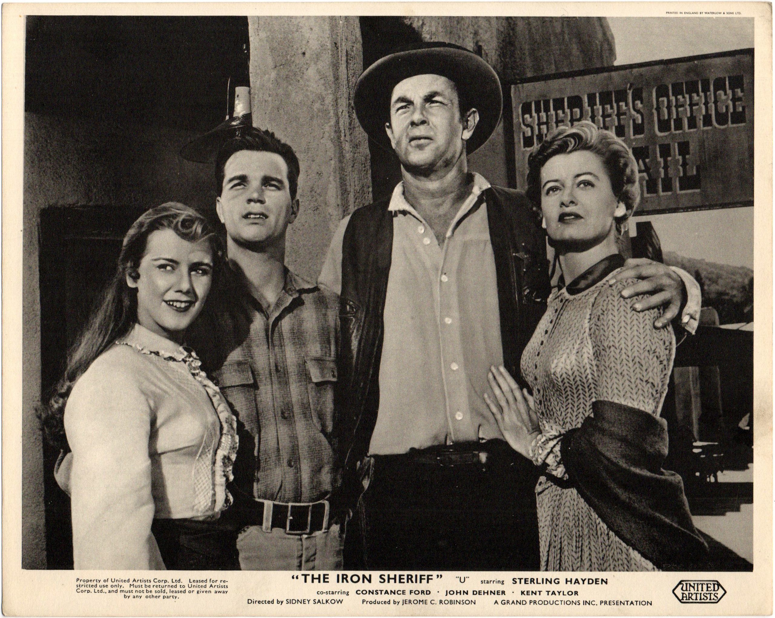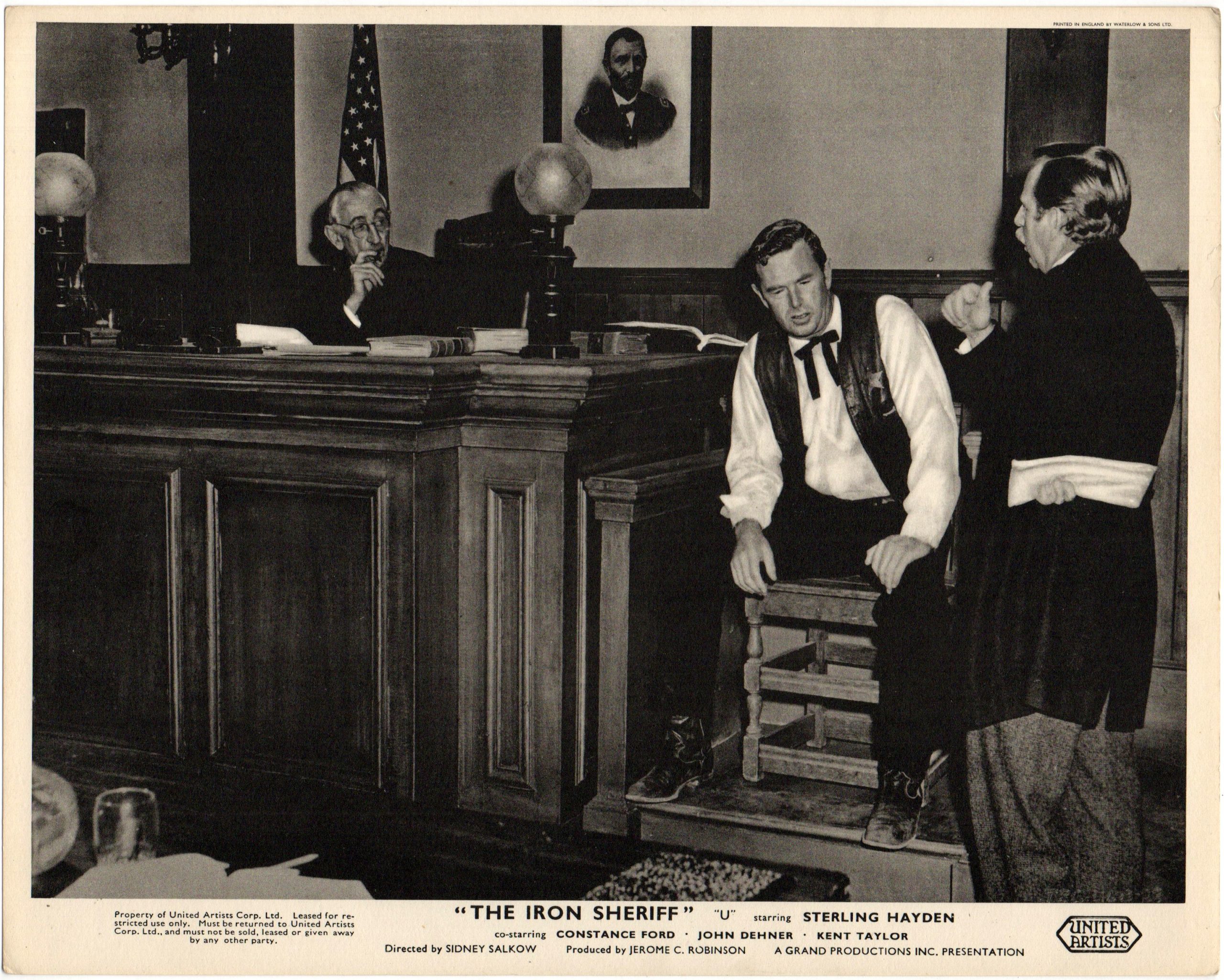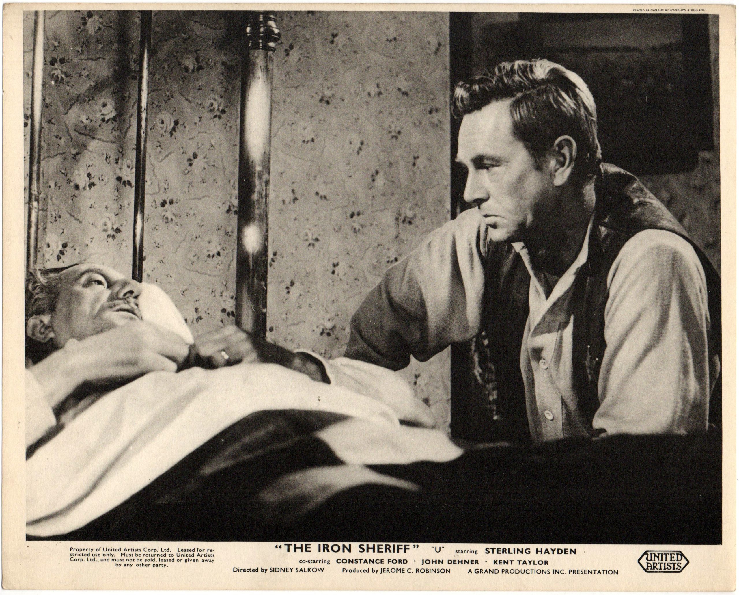 7 Original 10 inch x 8 inch Front-of-House Stills (Lobby Cards) for the 1957 Sidney Salkow Western THE IRON SHERIFF starring Sterling Hayden, Constance Ford, John Dehner, Kent Taylor, Darryl Hickman, Walter Sande, Frank Ferguson, King Donovan, Mort Mills and Peter Miller.