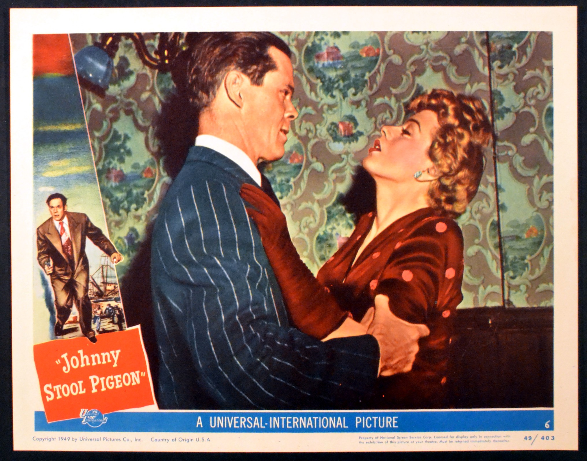 Original 11 inch x 14 inch U.S. Lobby Card of SHELLEY WINTERS & DAN DURYEA in the 1949 William Castle Film Noir JOHNNY STOOL PIGEON, based on a story by Henry Jordan.