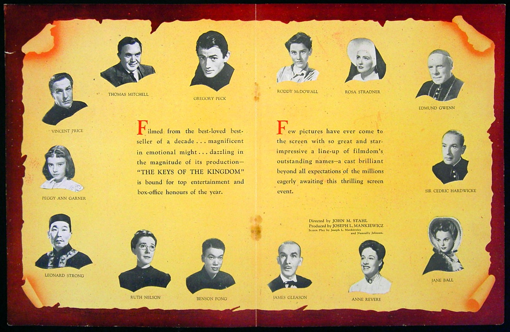 Original British 11 inch x 17 inch Double-Sided Trade Advertisement for the 1944 John M. Stahl Drama THE KEYS OF THE KINGDOM, based on the novel by A.J. Cronin and starring Gregory Peck, Thomas Mitchell and Vincent Price.