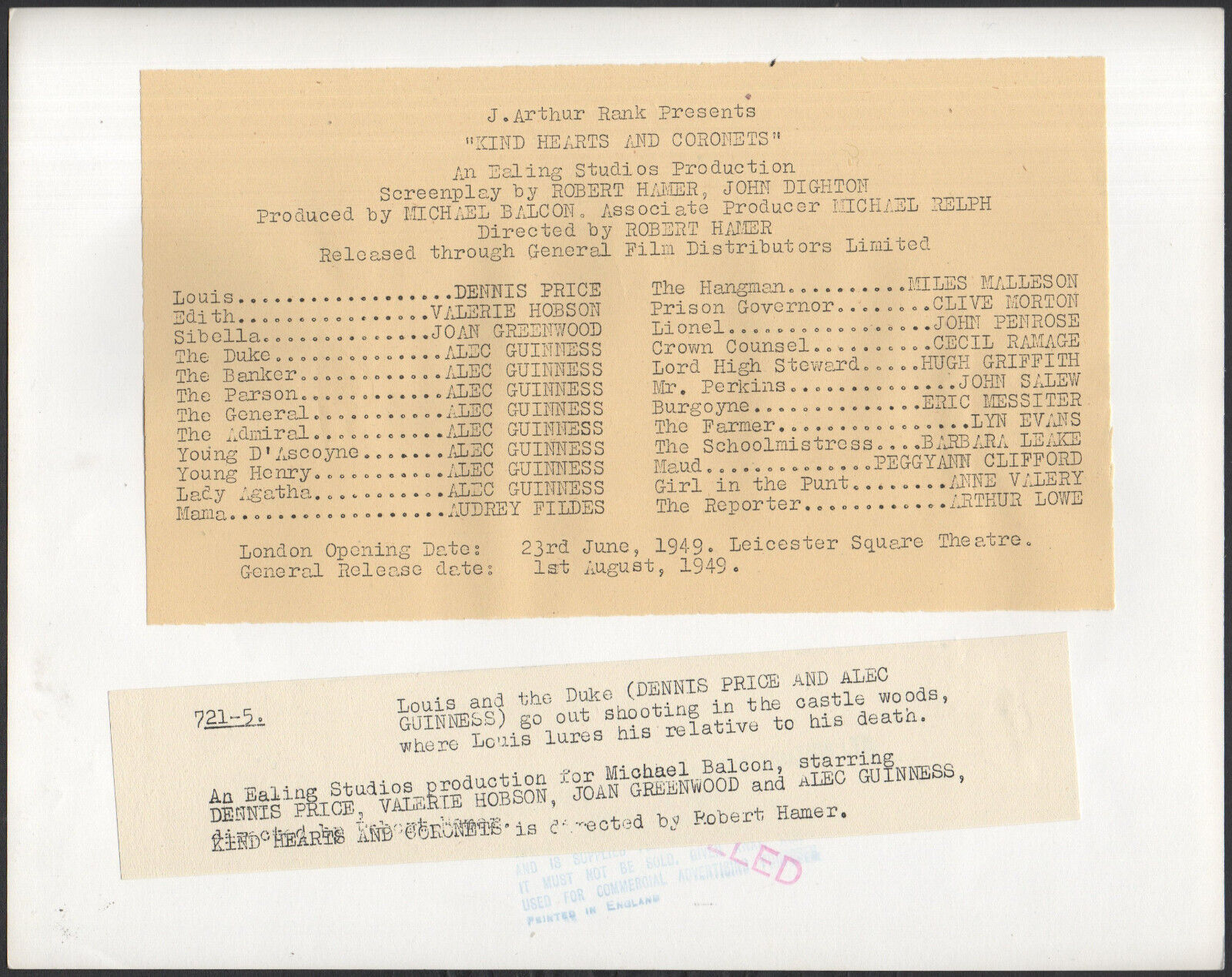 Original 10 inch x 8 inch Still of ALEC GUINNESS & DENNIS PRICE in the 1949 Robert Hamer Ealing Studios Black Comedy KIND HEARTS AND CORONETS, based on the novel by Roy Horniman.