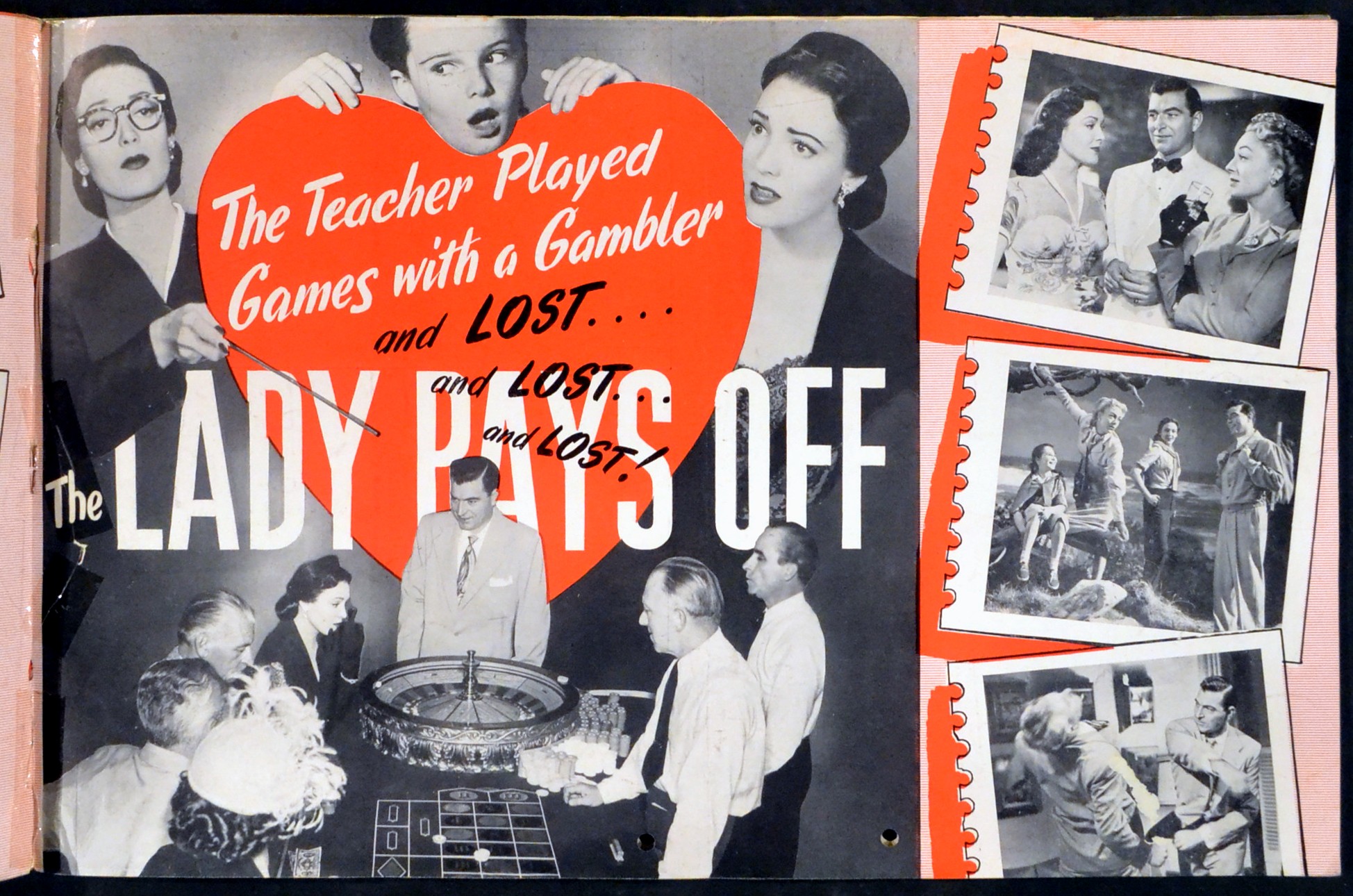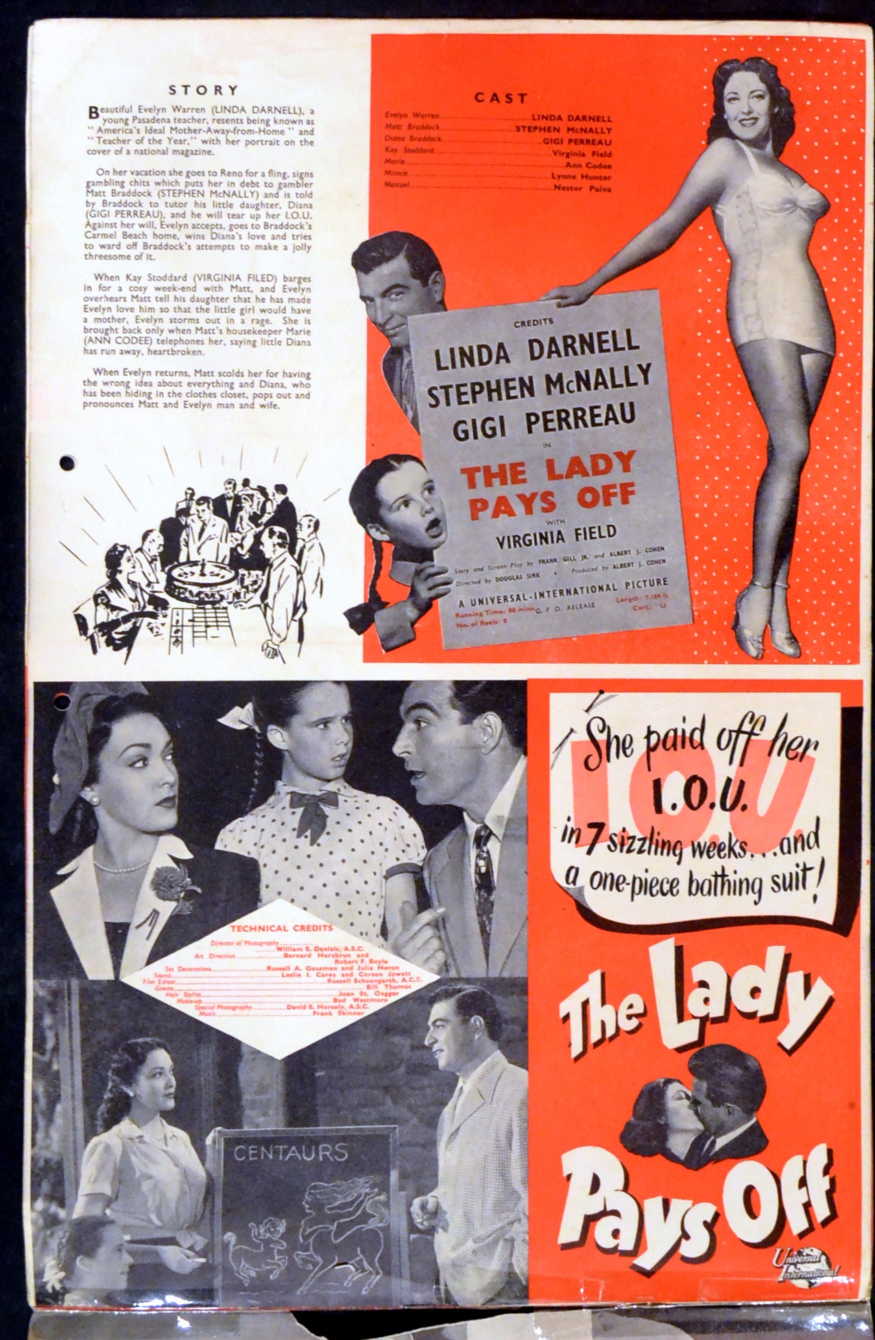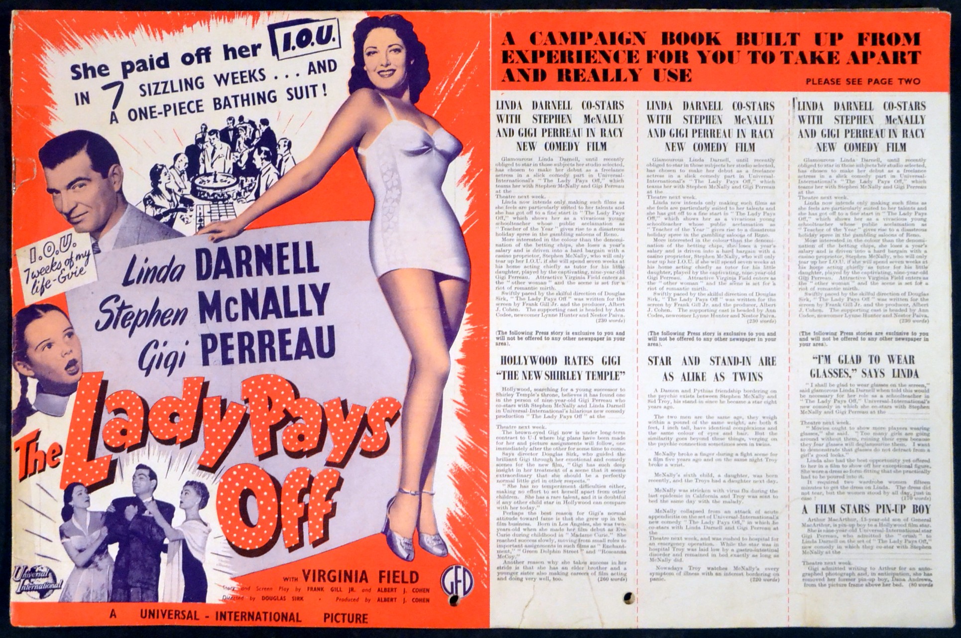Original British 17 inch x 11 inch 8 Page illustrated Campaign Book for the 1951 Douglas Sirk Gambling Comedy THE LADY PAYS OFF starring Linda Darnell, Stephen McNally, Gigi Perreau, Virginia Field, Ann Codee and Nestor Paiva.