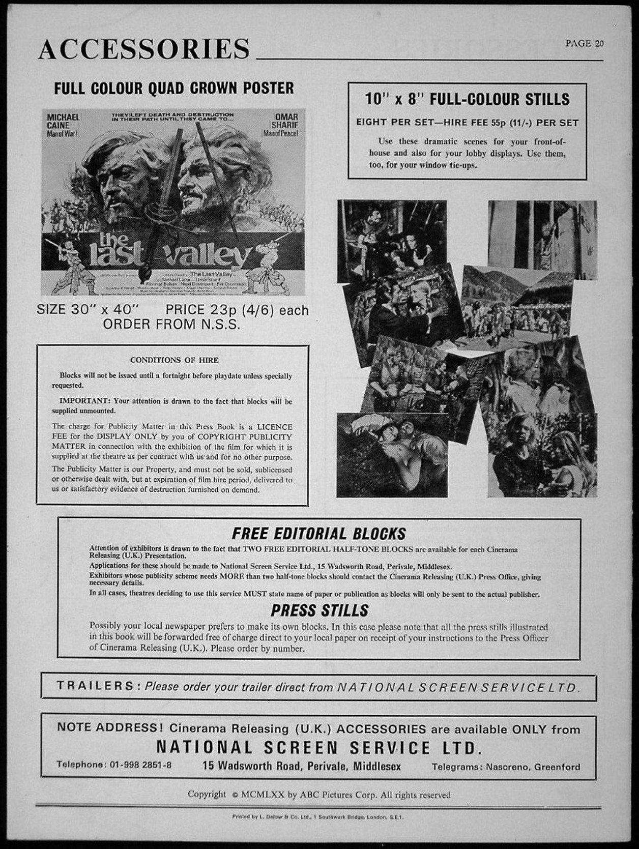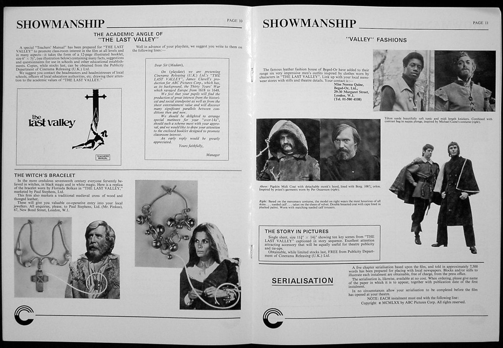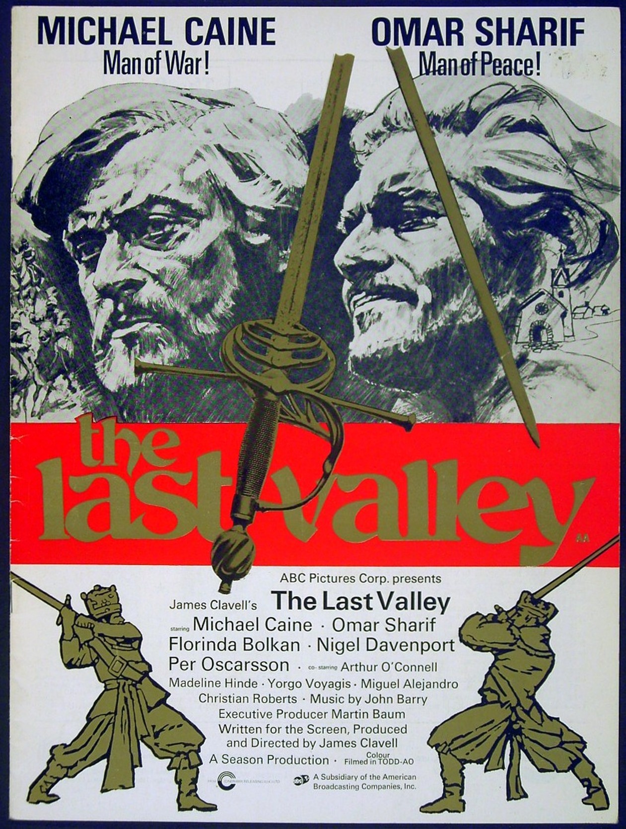 Original British 12 3/4 inch x 9 1/2 inch 20 page illustrated Pressbook for the 1971 James Clavell Adventure THE LAST VALLEY, based on the novel by J.B. Pick and starring Michael Caine, Omar Sharif, Florinda Bolkan, Nigel Davenport, Per Oscarsson, Arthur O’Connell,Madeline Hinde, Michael Gothard, Brian Blessed, Vladek Sheybal and Edward Underdown.