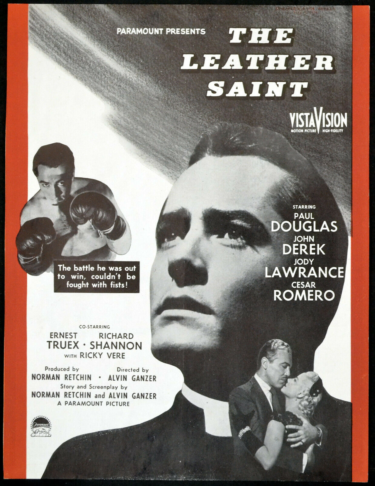 Original British 11 inch x 8 3/8 inch Trade Advertisement from Kinematograph Weekly for the 1956 Alvin Ganzer Drama THE LEATHER SAINT, based on the novel by William E. Barrett and starring Paul Douglas, John Derek, Jody Lawrance and Cesar Romero.