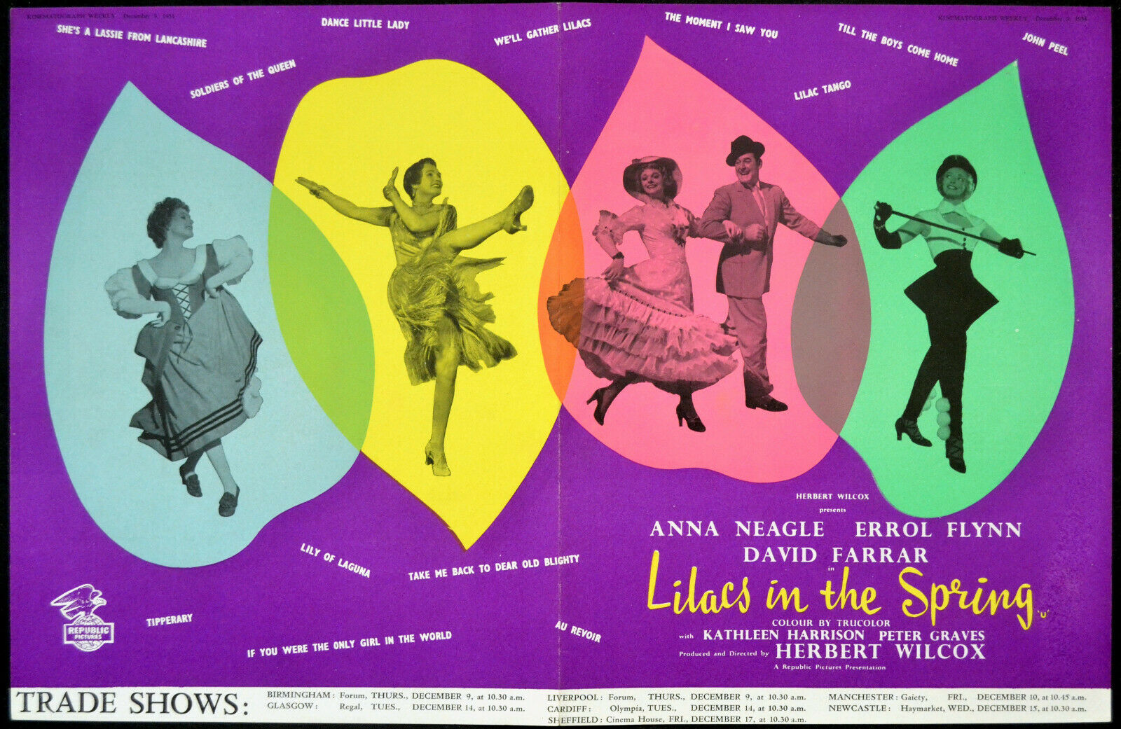 Original British 17 inch x 11 inch Trade Advertisement from Kinematograph Weekly for the 1954 Herbert Wilcox Romantic Musical LILACS IN THE SPRING starring Errol Flynn, Anna Neagle, David Farrar, Kathleen Harrison, Peter Graves, Helen Haye, Stephen Boyd and Sean Connery.