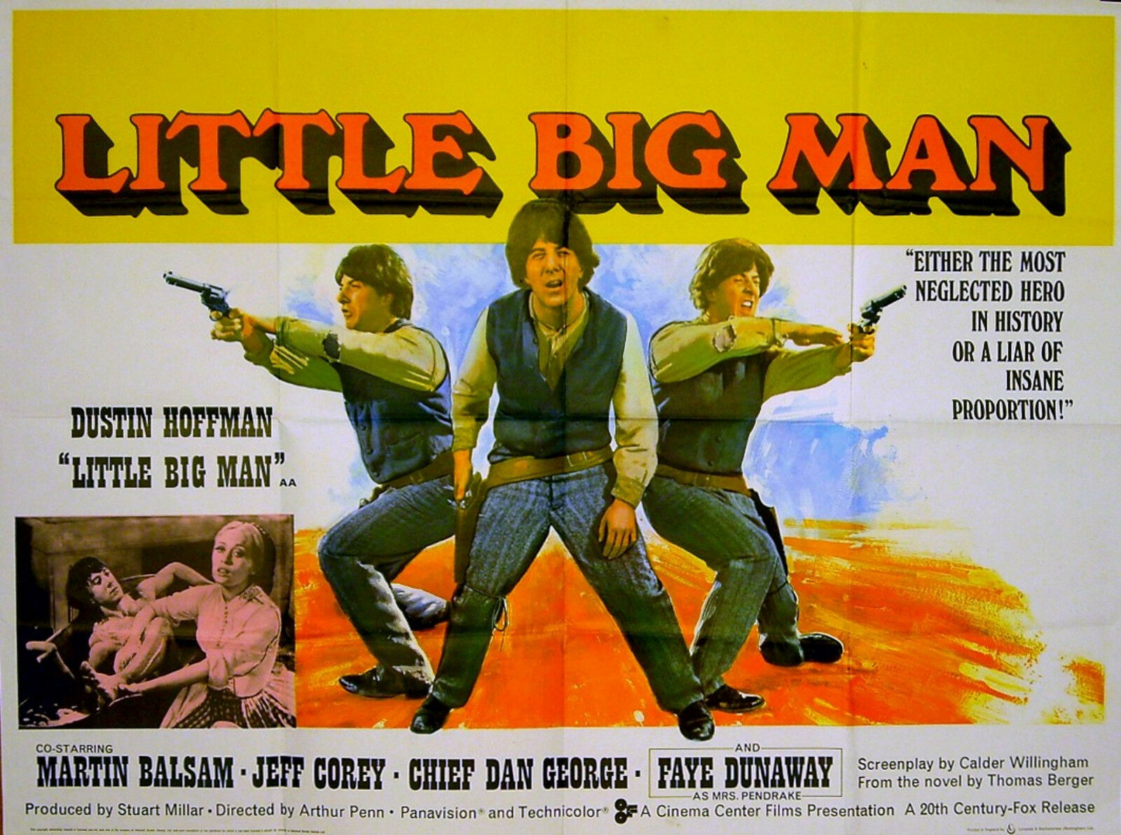 Original British 30 inch x 40 inch Quad Poster for the 1970 Arthur Penn Western LITTLE BIG MAN, based on the novel by Thomas Berger and starring Dustin Hoffman, Martin Balsam, Faye Dunaway and Chief Dan George.
