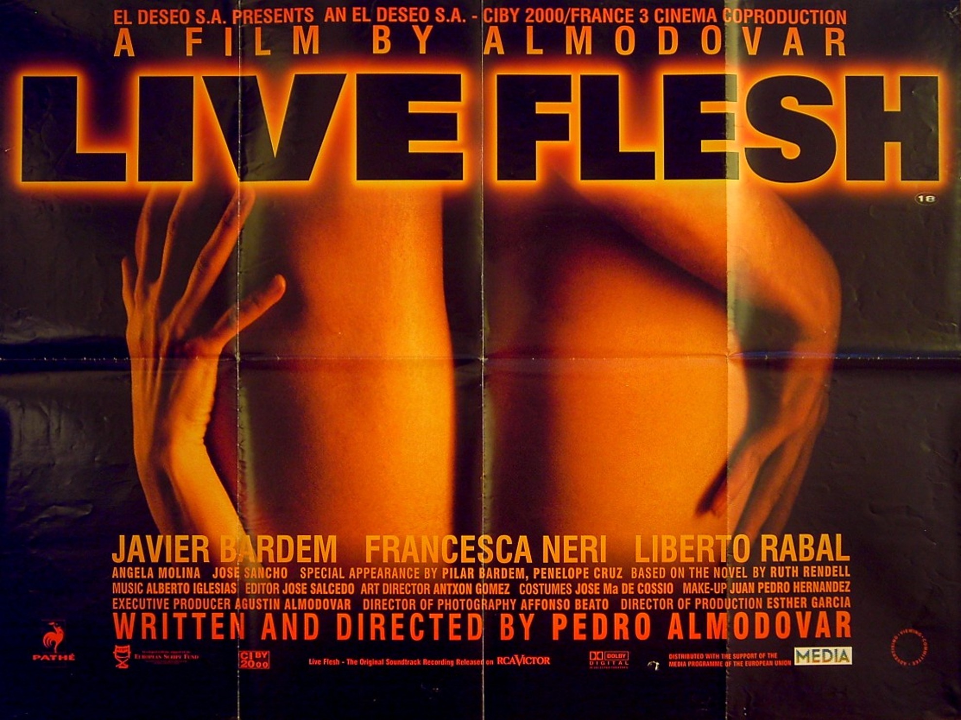 Original British 30 inch x 40 inch Quad Poster for the 1997 Pedro Almodóvar Romantic Drama CARNE TREMULA (LIVE FLESH) starring Javier Bardem, Francesca Neri, Angela Molina and Penélope Cruz.