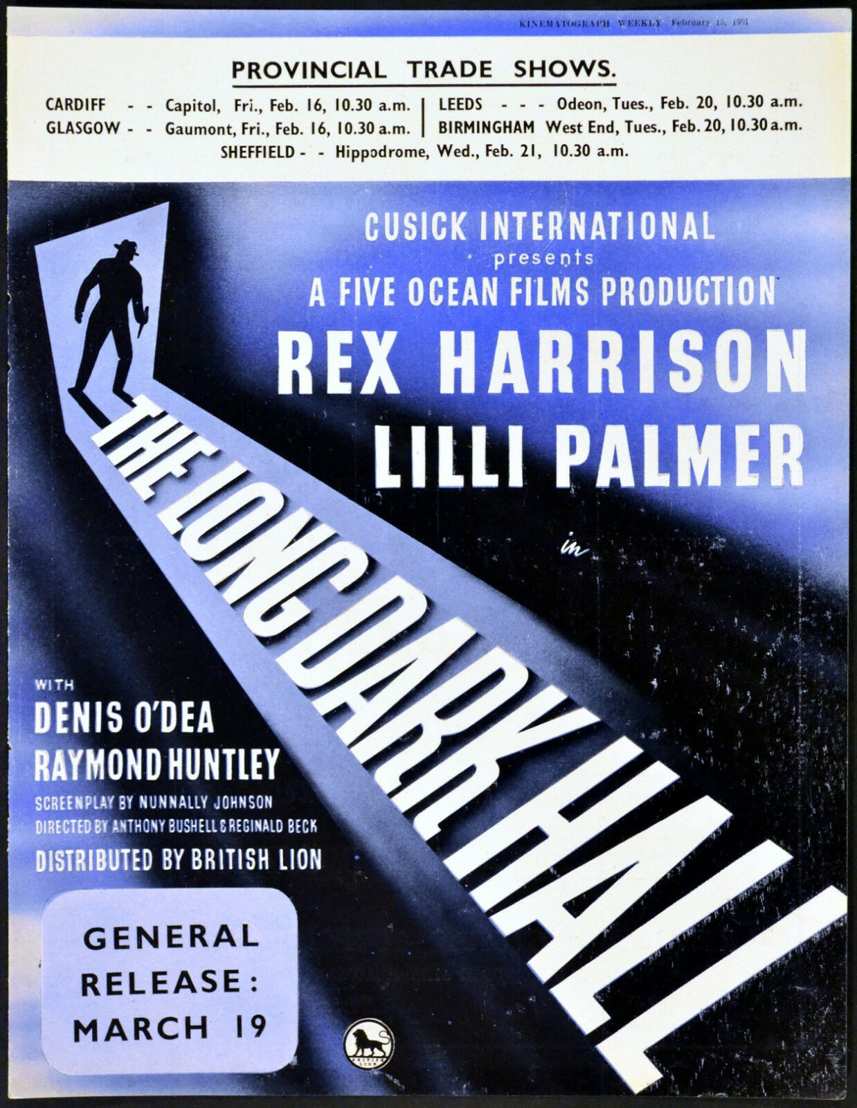 Original British 11 inch x 8 1/2 inch Trade Advertisement from Kinematograph Weekly for the 1951 Reginald Beck & Anthony Bushell Crime Drama THE LONG DARK HALL, based on the novel “A Case to Answer” by Edgar Lustgarten and starring Rex Harrison, Lilli Palmer, Tania Heald, Anthony Dawson, Brenda De Banzie, Raymond Huntley, Denis O’Dea, Anthony Bushell, Meriel Forbes, Michael Medwin, Colin Gordon, Lionel Murton, Eric Pohlmann, Jenny Laird, Lilli Molnar and Jill Bennett.
