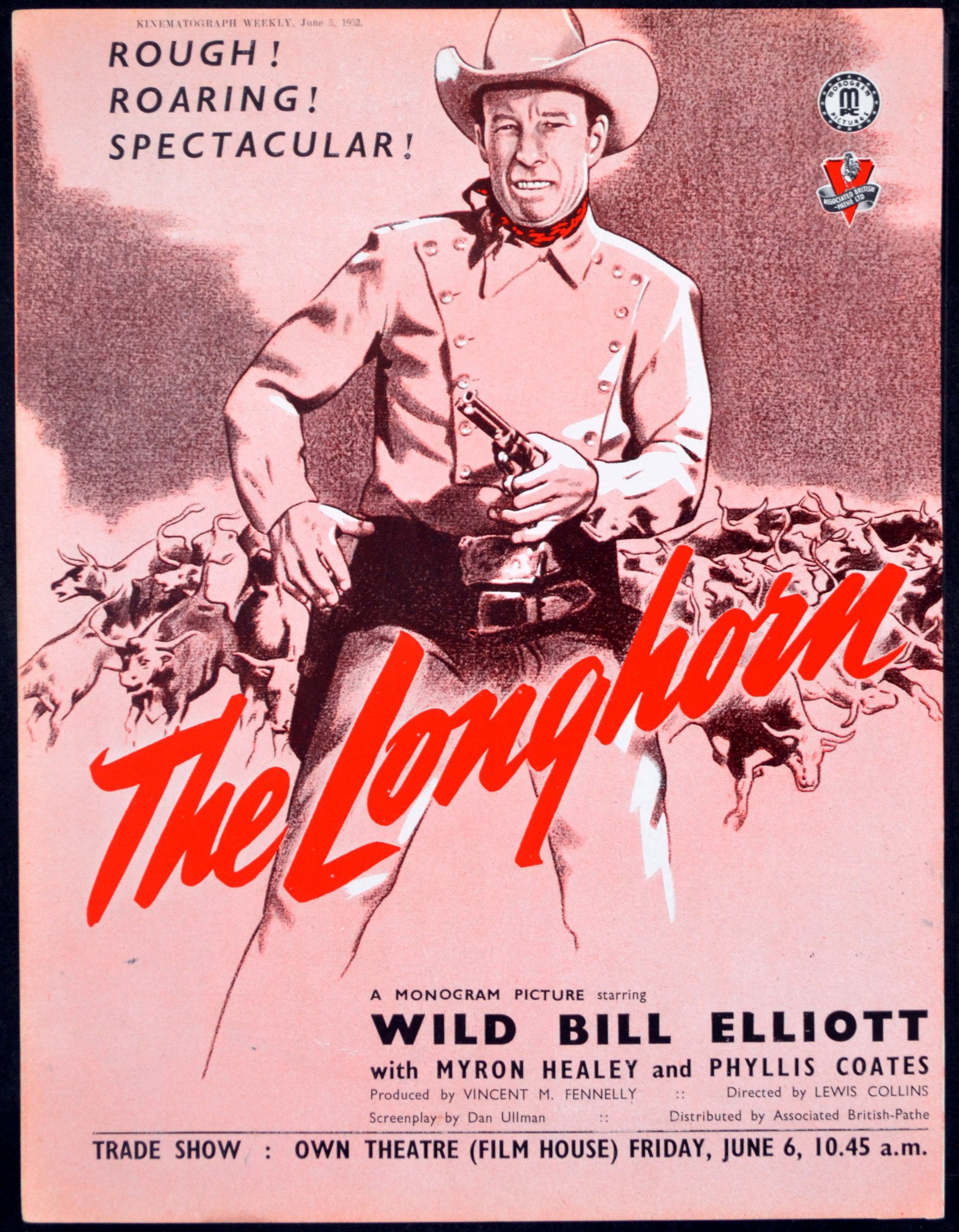 Original 1952 British 11 inch x 8 1/2 inch Trade Advertisement from Kinematograph Weekly for the 1951 Lewis D. Collins Western THE LONGHORN starring William ‘Wild Bill’ Elliott, Myron Healey, Phyllis Coates, I. Stanford Jolley and Lane Bradford.