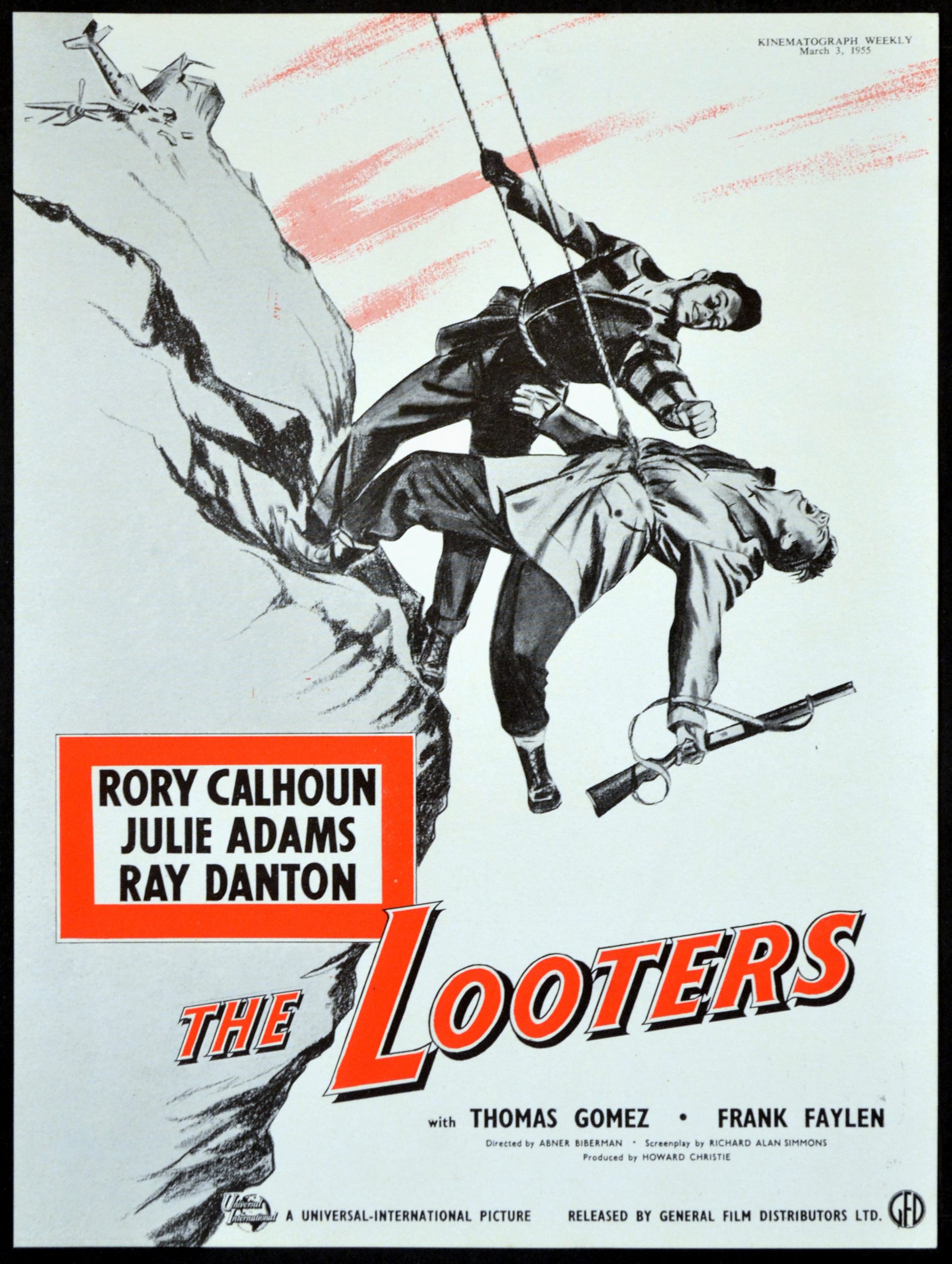 Original British 11 inch x 8 1/4 inch Trade Advertisement from Kinematograph Weekly for the 1955 Abner Biberman Adventure THE LOOTERS starring Rory Calhoun, Julie Adams, Ray Danton, Thomas Gomez and Frank Faylen.