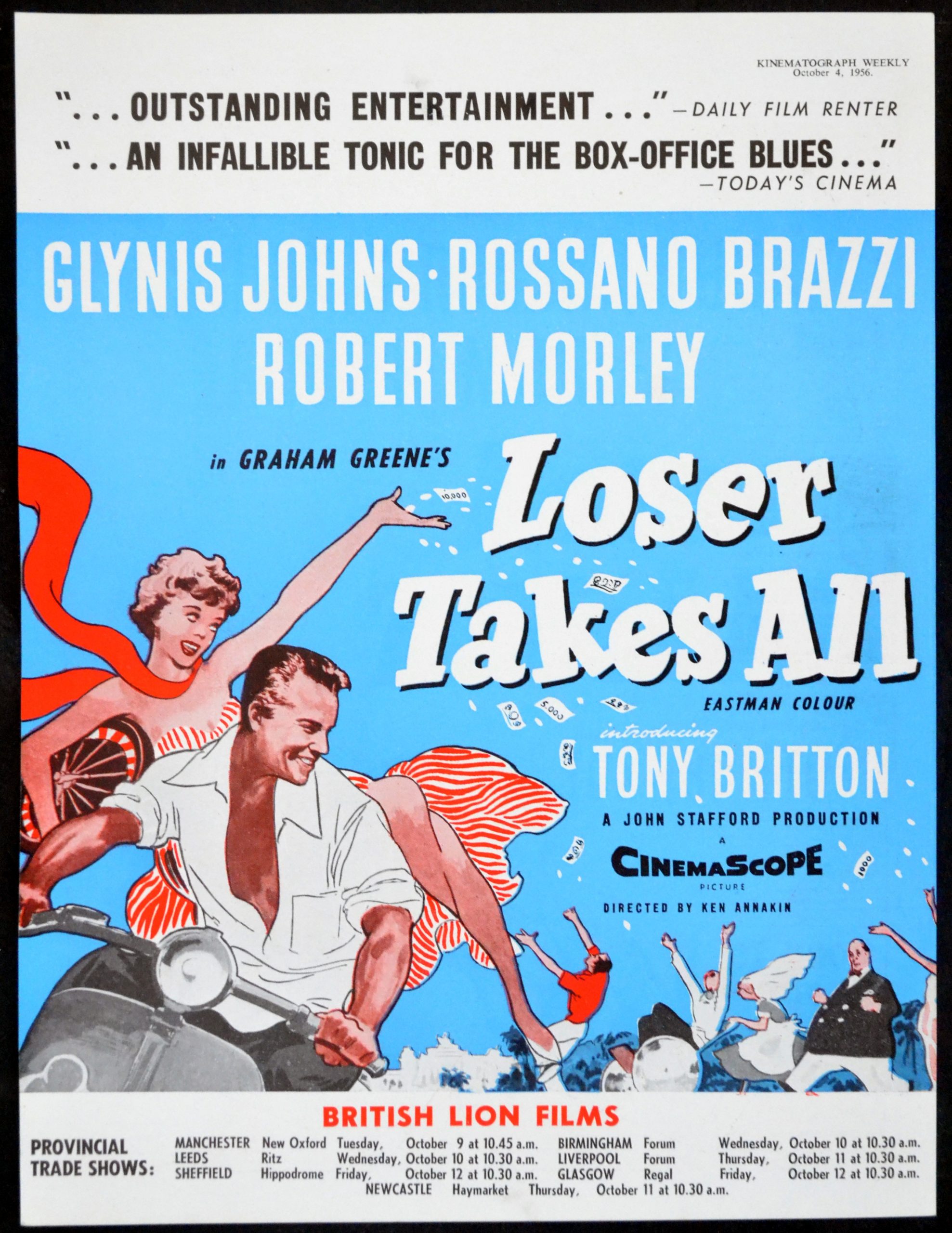 Original British 11 inch x 8 3/8 inch Trade Advertisement from Kinematograph Weekly for the 1956 Ken Annakin Comedy LOSER TAKES ALL, written by Graham Greene and starring Glynis Johns, Rossano Brazzi, Robert Morley, Felix Aylmer, Joyce Carey, Geoffrey Keen, Peter Illing and Tony Britton.