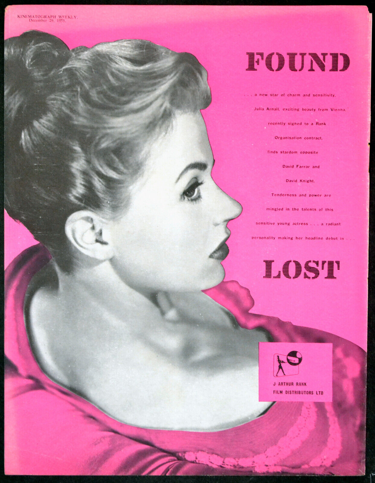 Original British 11 inch x 8 1/2 inch Trade Advertisement from Kinematograph Weekly for the 1956 Guy Green Thriller LOST starring David Farrar, David Knight, Julia Arnall, Anthony Oliver, Eleanor Summerfield, Thora Hird, Marjorie Rhodes and Meredith Edwards.