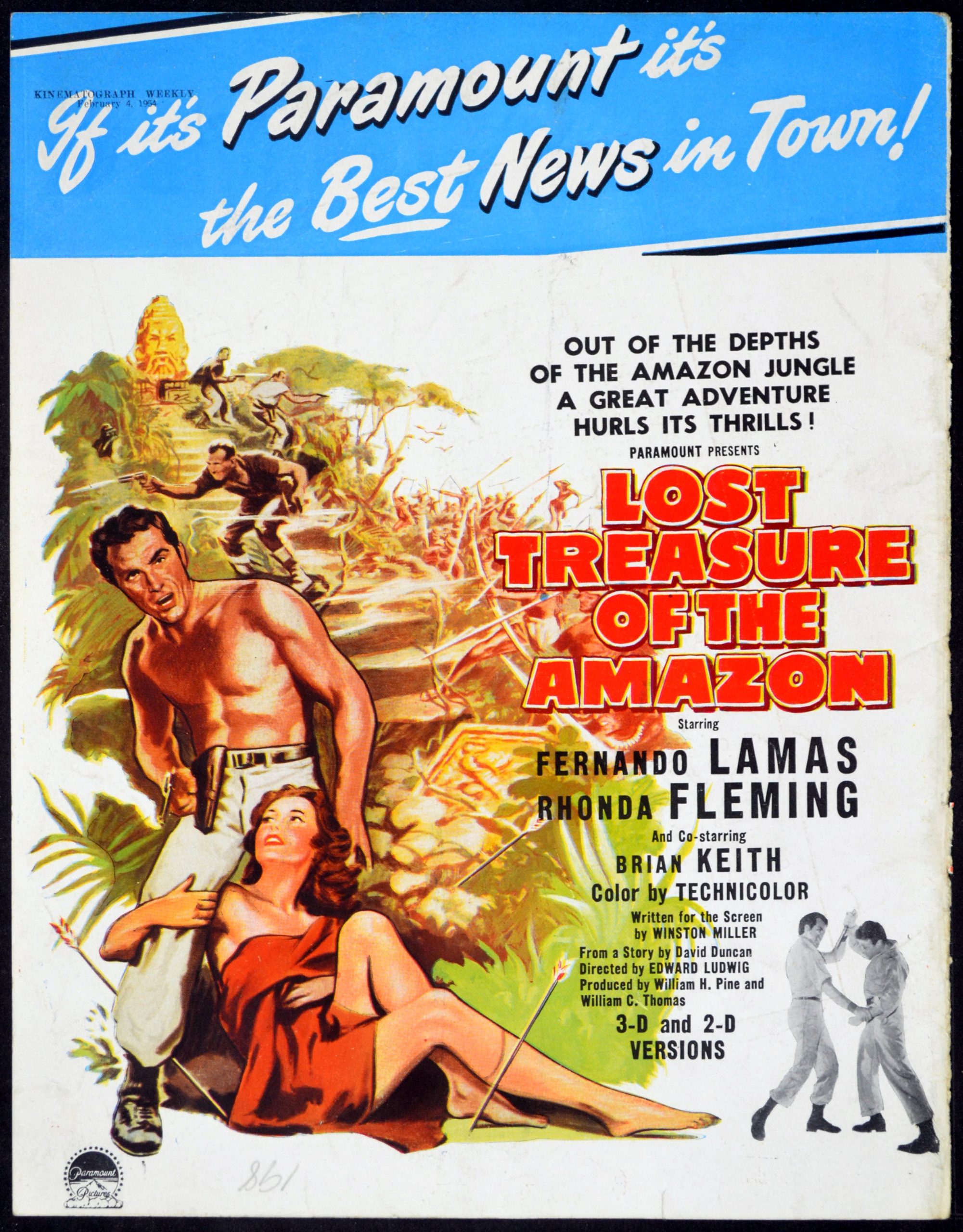 Original British 11 inch x 8 1/2 inch Trade Advertisement from Kinematograph Weekly for the 1954 Edward Ludwig 3-D Jungle Adventure LOST TREASURE OF THE AMAZON, based on a story by David Duncan and starring Fernando Lamas, Rhonda Fleming, Brian Keith, Rita Morena, Richard Denning and Lon Chaney Jr..