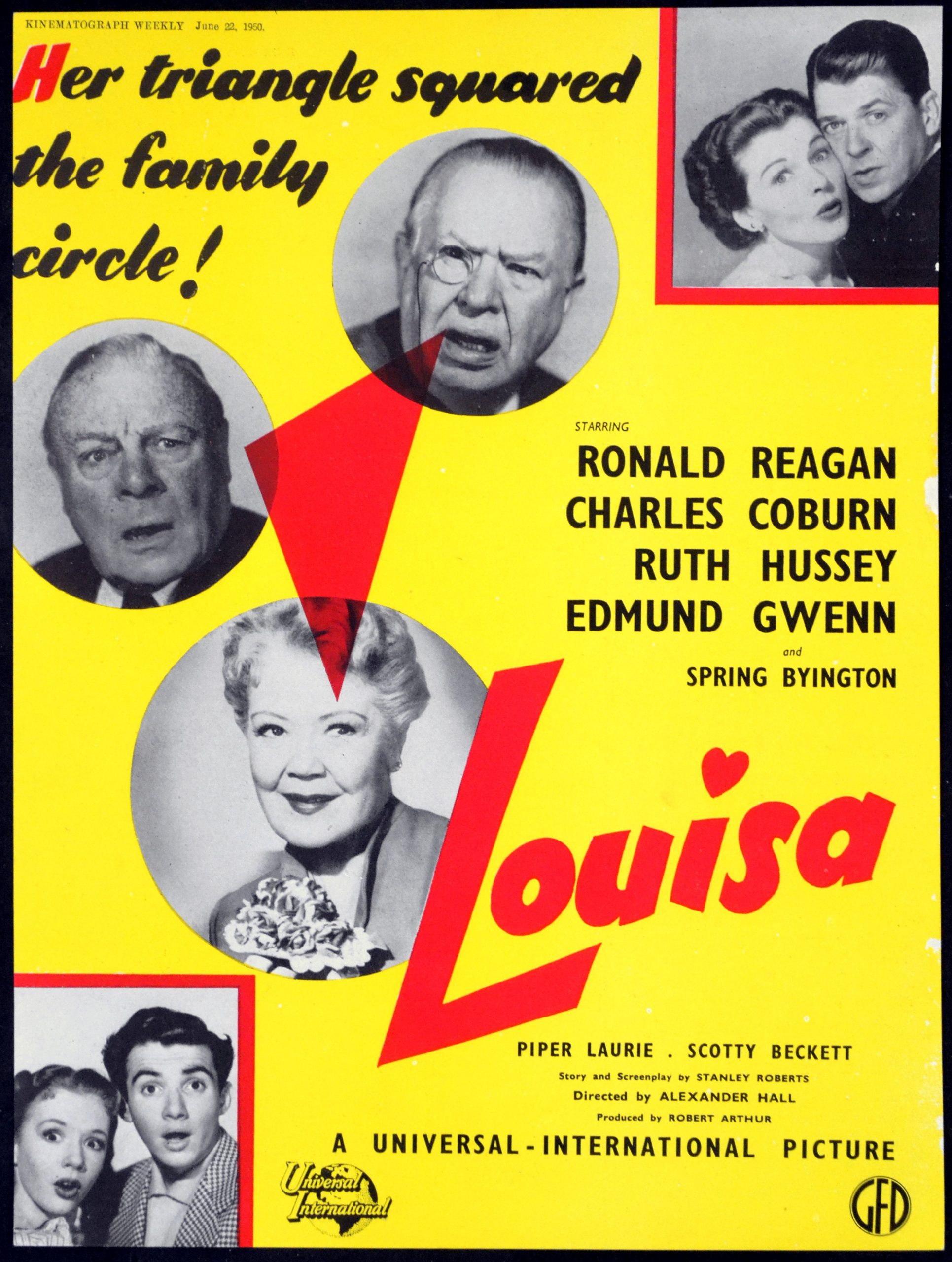 Original British 11 inch x 8 1/2 inch Trade Advertisement from Kinematograph Weekly for the 1950 Alexander Hall Comedy LOUISA starring Ronald Reagan, Charles Coburn, Ruth Hussey and Edmund Gwenn.