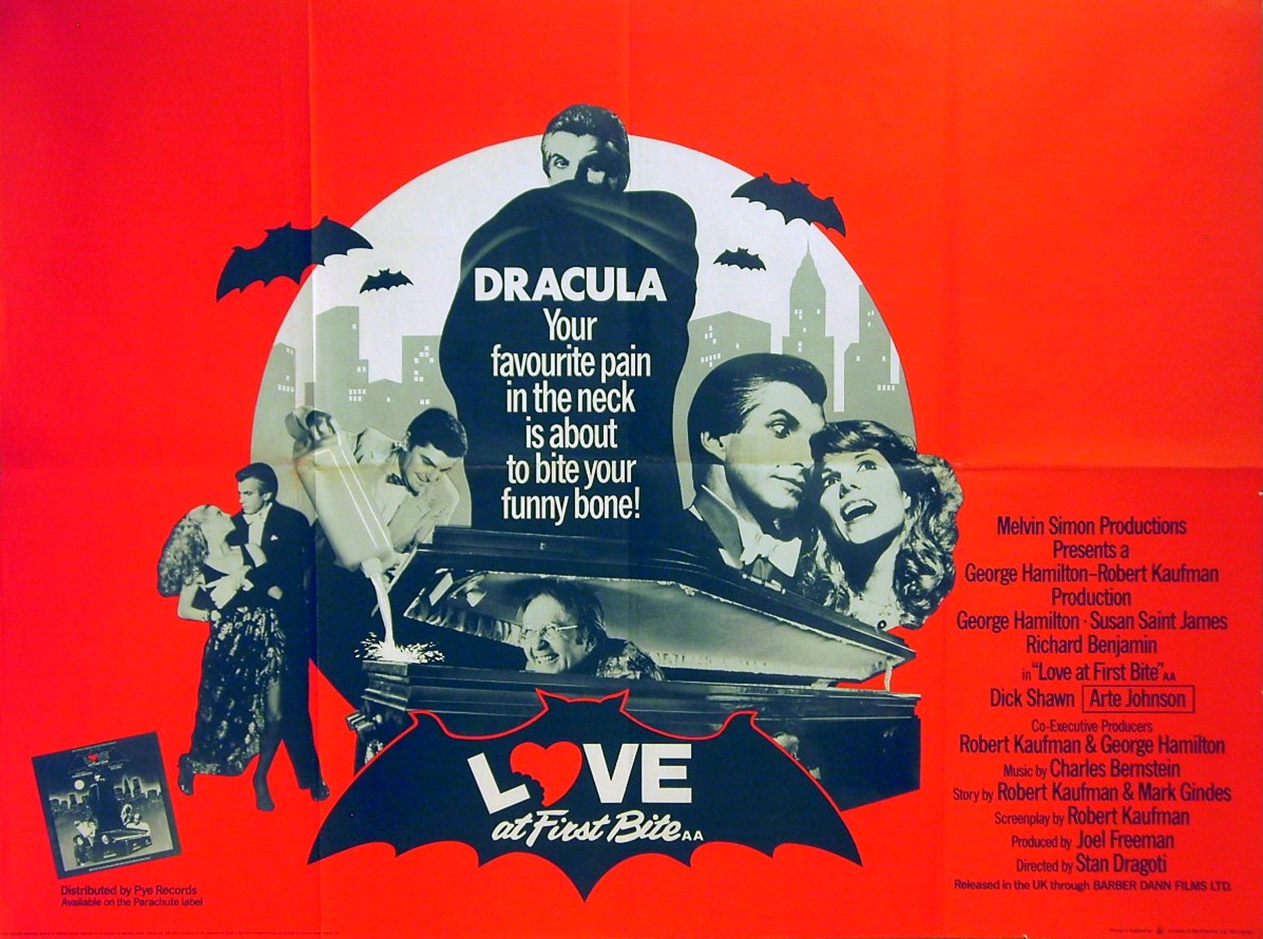 Original British 30 inch x 40 inch Quad Poster for the 1979 Stan Dragoti Vampire Comedy LOVE AT FIRST BITE starring George Hamilton, Susan Saint James and Richard Benjamin.