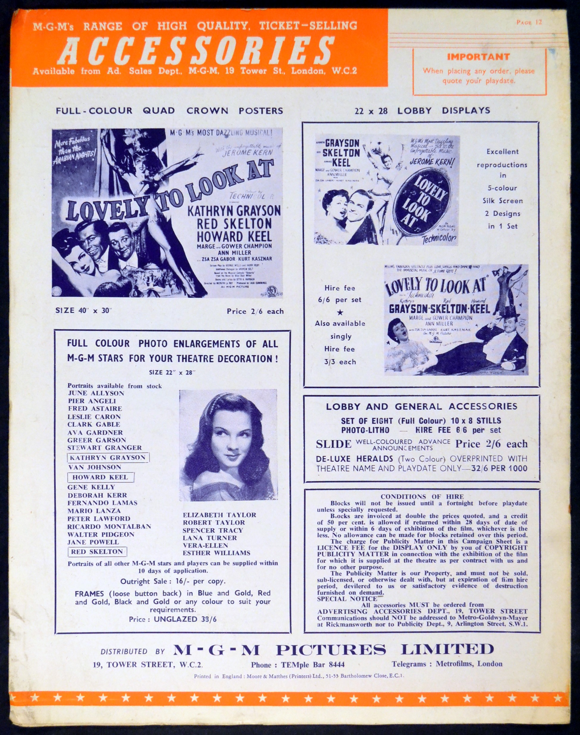 Original British 12 3/8 inch x 9 3/4 inch 12 page illustrated Pressbook for the 1952 Mervyn LeRoy Musical Comedy LOVELY TO LOOK AT starring Kathryn Grayson, Red Skelton, Howard Keel, Marge & Gower Champion, Ann Miller, Zsa Zsa Gabor, Kurt Kasznar and Harry Ruby.
