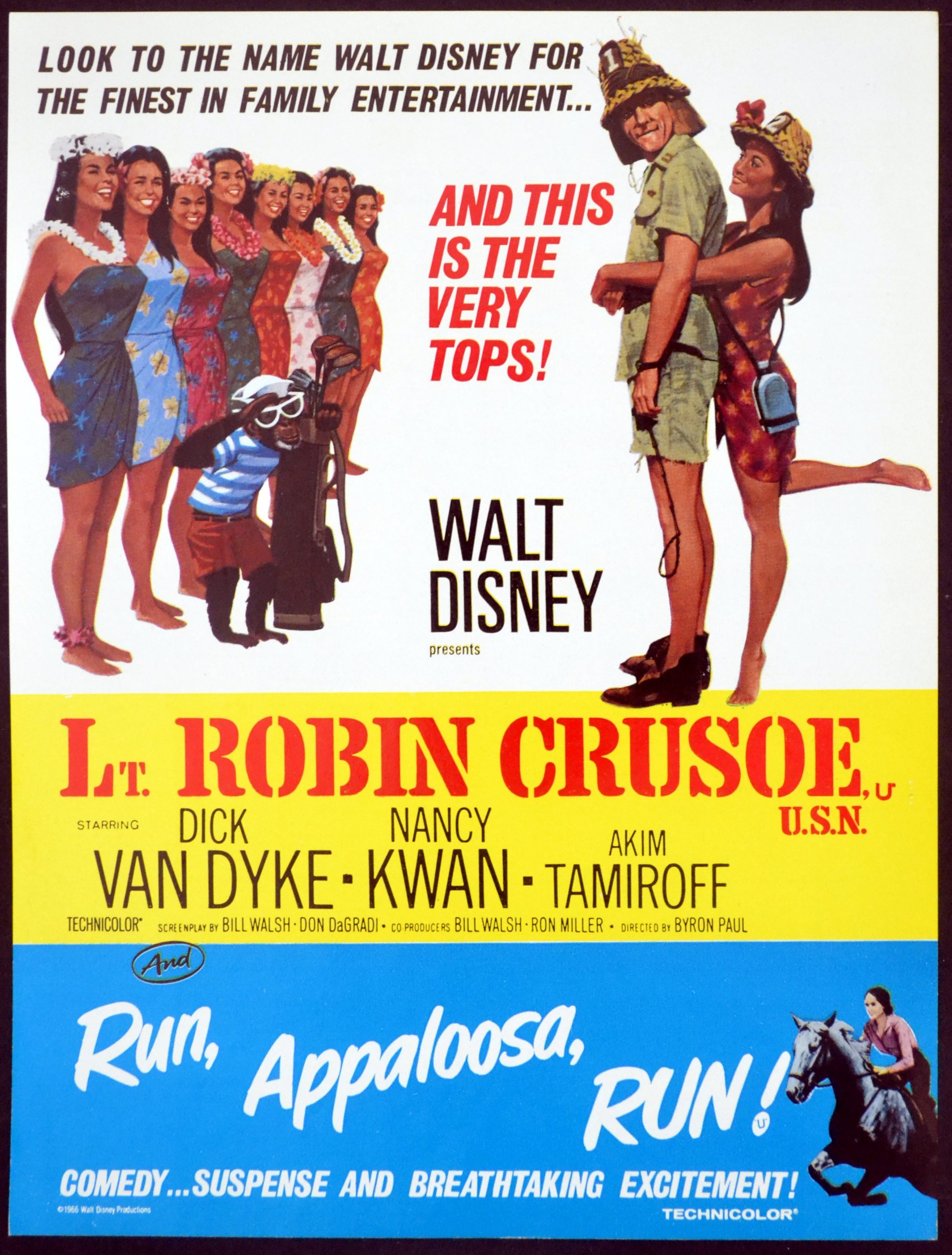 Original British 11 inch x 8 1/4 inch Double-Bill Trade Advertisement from Kinematograph Weekly for the 1966 Byron Paul Walt Disney Comedy LT. ROBIN CRUSOE, R.N. starring Dick Van Dyke, Nancy Kwan and Akim Tamiroff.