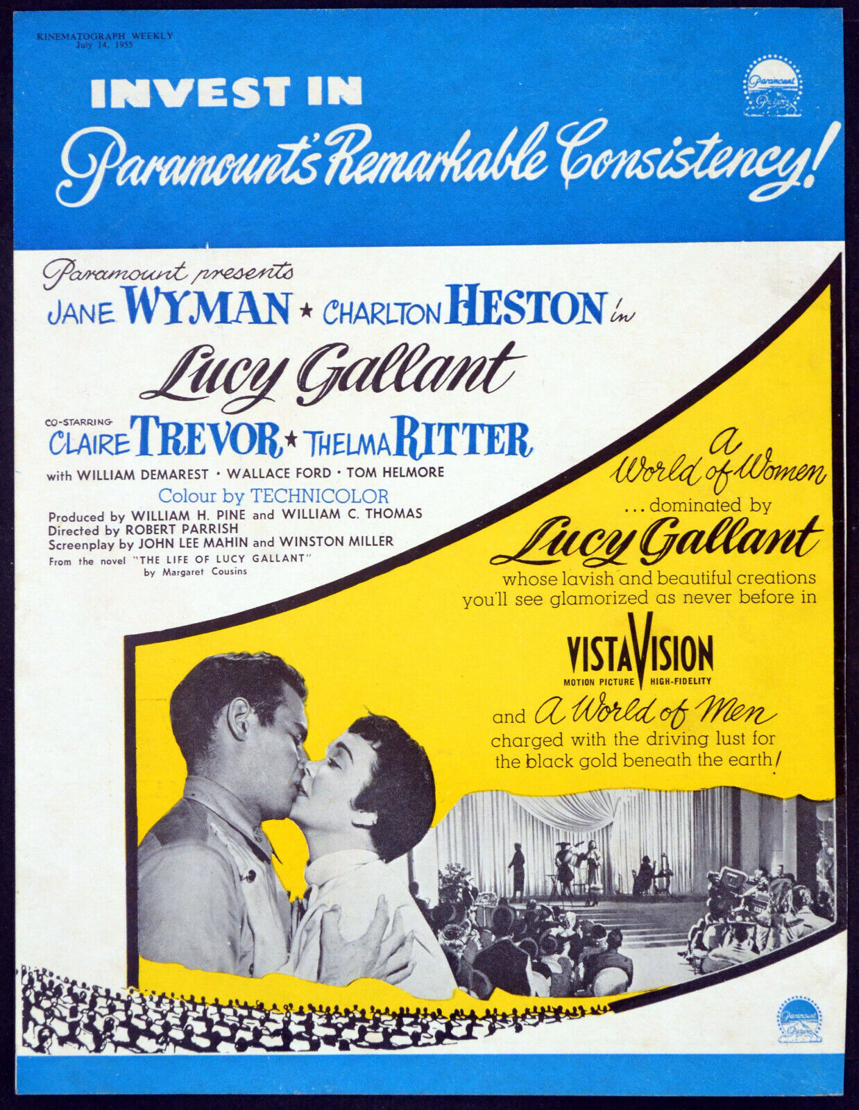 Original British 11 inch x 8 1/2 inch Trade Advertisement from Kinematograph Weekly for the 1955 Robert Parrish Drama LUCY GALLANT, based on the novel by Margaret Cousins and starring Jane Wyman, Charlton Heston, Claire Trevor, Thelma Ritter, William Demarest, Wallace Ford, Tom Helmore and Edith Head.