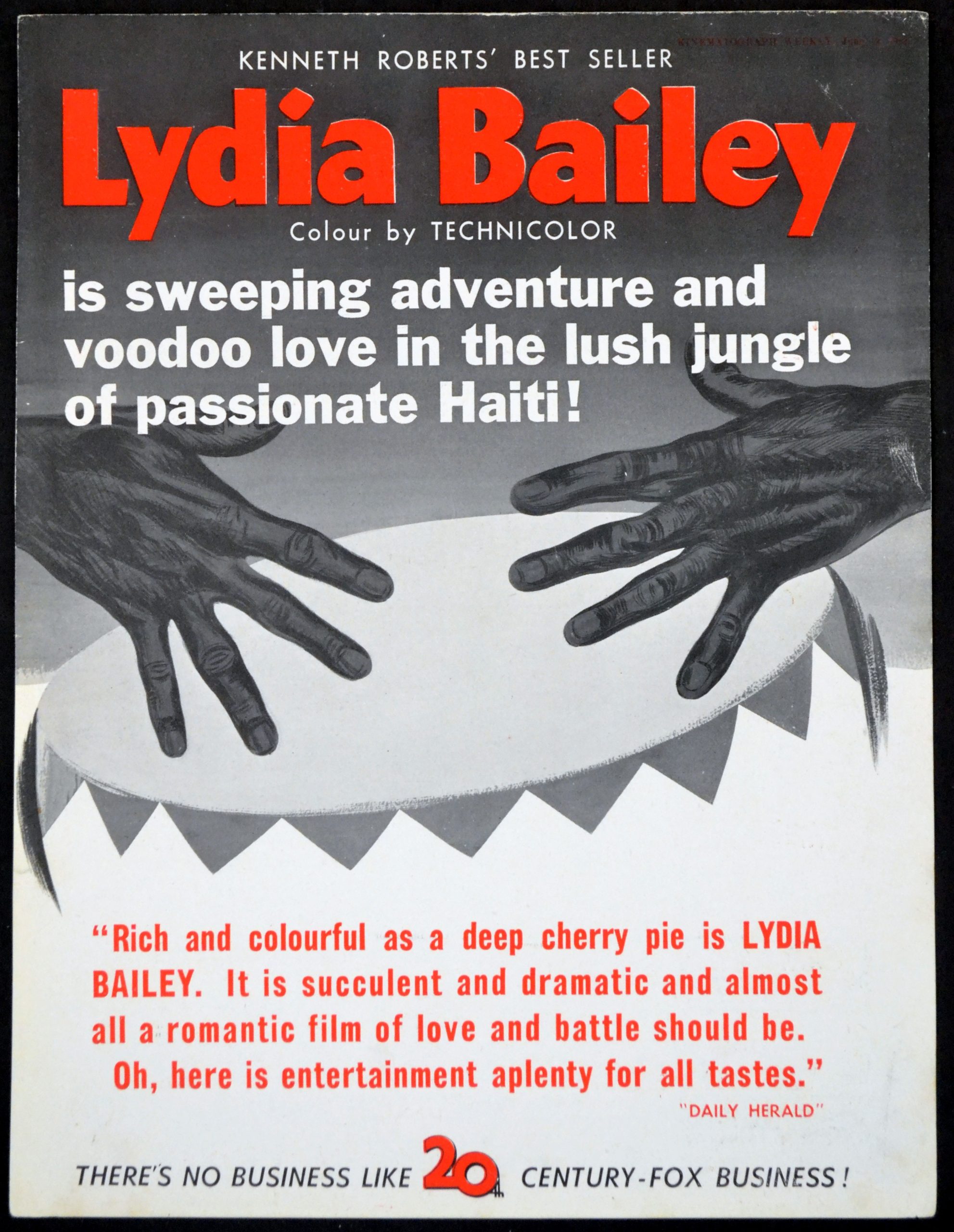 Original British 11 inch x 8 1/2 inch Trade Advertisement from Kinematograph Weekly for the 1952 Jean Negulesco Drama LYDIA BAILEY, based on the novel by Kenneth Roberts and starring Anne Francis, Dale Robertson and Charles Korvin.
