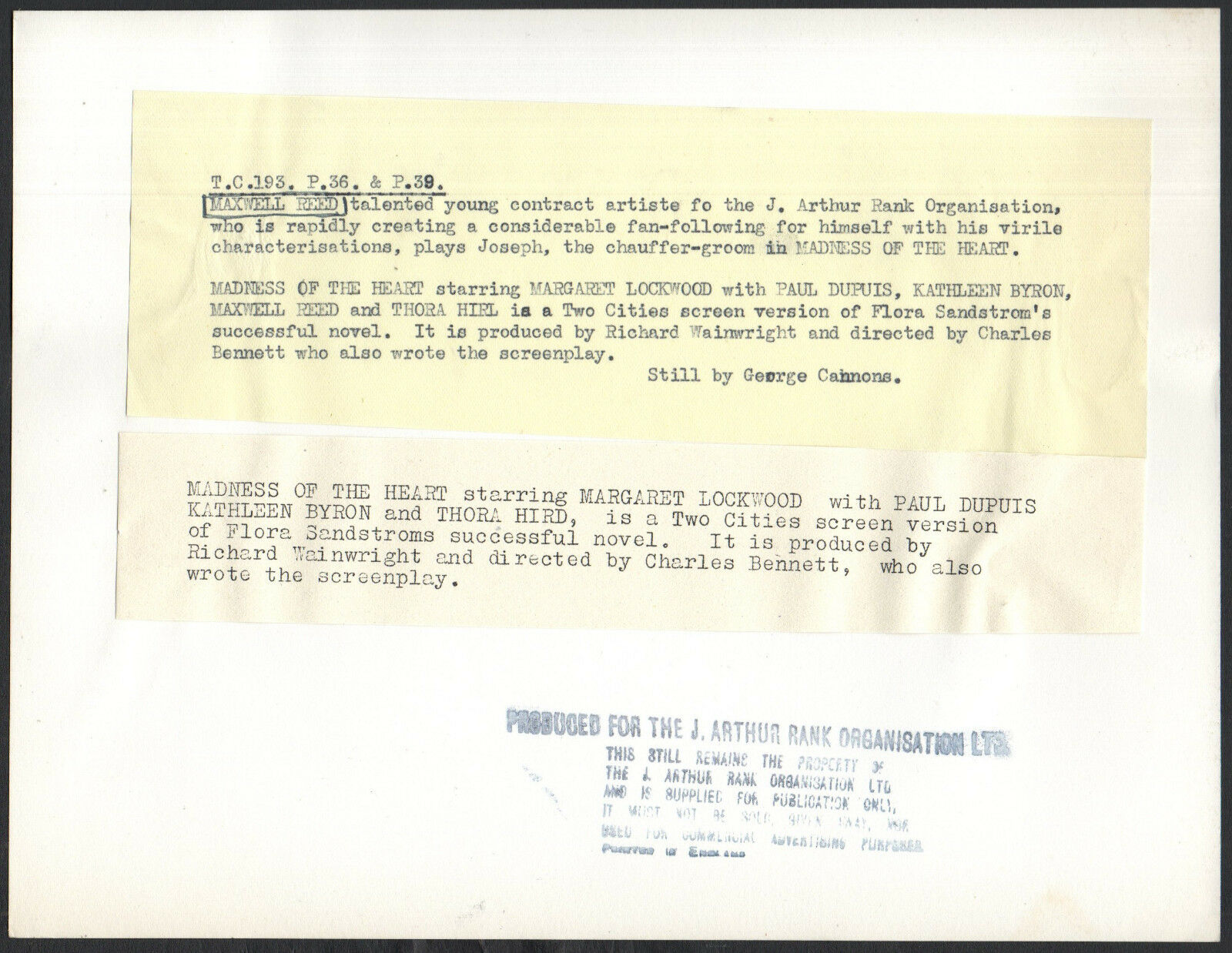 Text on reverse: MAXWELL REED talented young contract artiste for the J. Arthur Rank Organisation, who is rapidly creating a considerable fan-following for himself with his virile characterisations, plays Joseph, the chauffer-groom in MADNESS OF THE HEART.