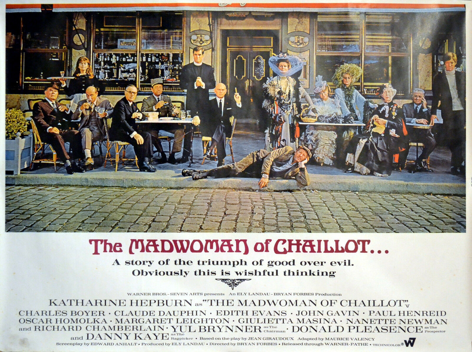 Original British 30 inch x 40 inch Quad Poster Style B for the 1969 Bryan Forbes Drama THE MADWOMAN OF CHAILLOT, based on the play by Jean Giraudoux and starring Katharine Hepburn, Charles Boyer, Claude Dauphin, Edith Evans, John Gavin, Paul Henreid, Oscar Homolka, Margaret Leighton, Giulietta Masina, Nanette Newman, Richard Chamberlain, Yul Brynner, Donald Pleasence and Danny Kaye.