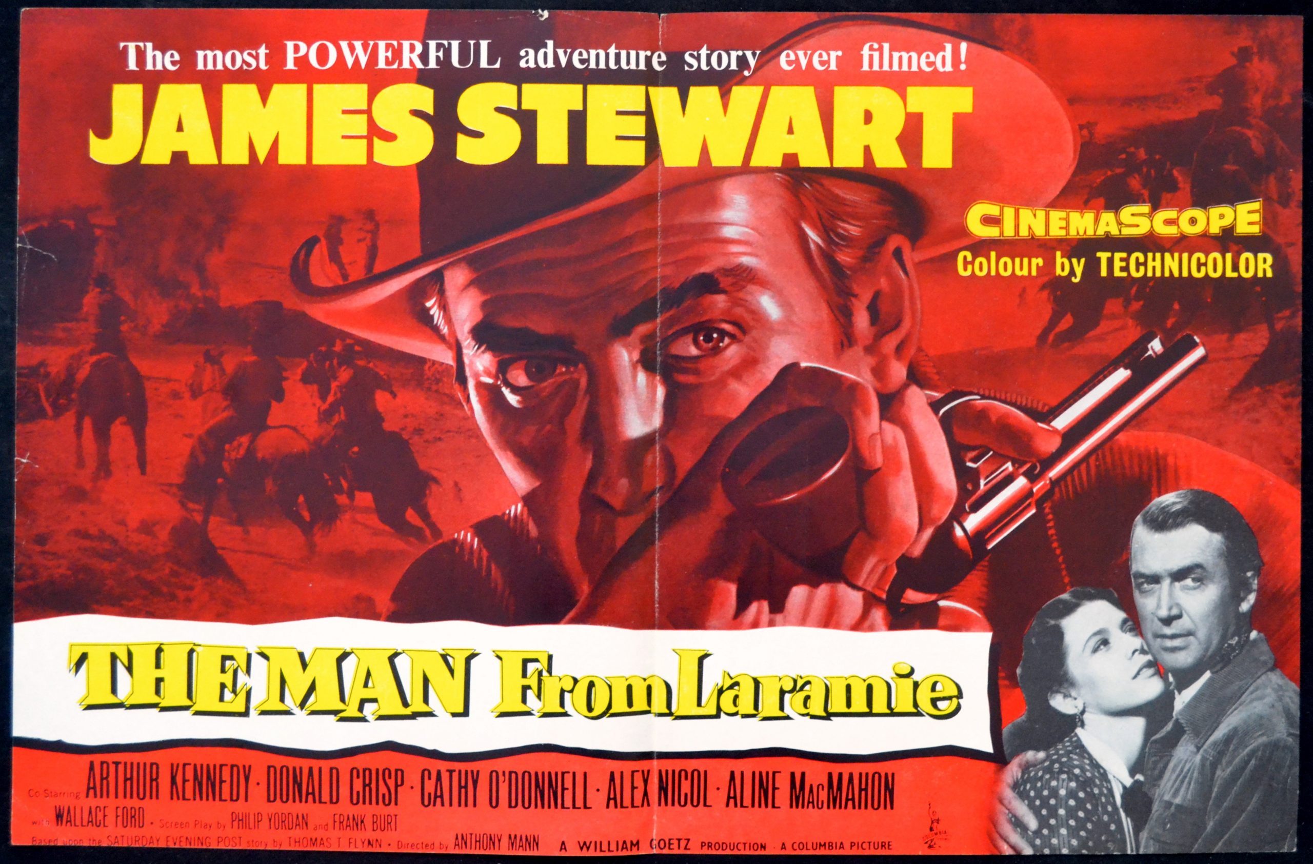 Original British 11 inch x 17 inch Trade Advertisement from Kinematograph Weekly for the 1955 Anthony Mann Western THE MAN FROM LARAMIE, based on the Saturday Evening Post story by Thomas T. Flynn and starring James Stewart, Arthur Kennedy, Donald Crisp, Cathy O’Donnell, Alex Nicol, Aline MacMahon and Wallace Ford.