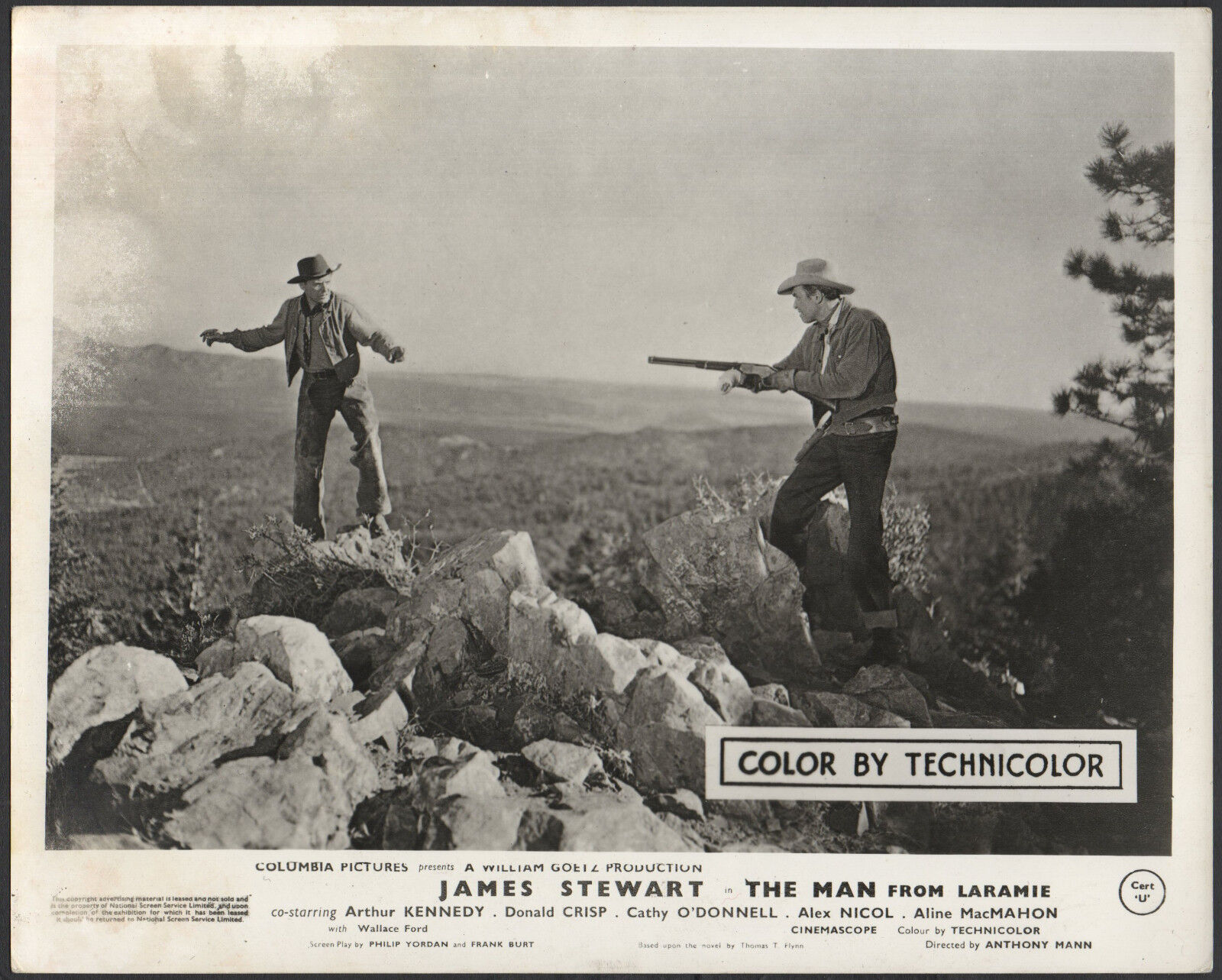 Original Re-Release British 10 inch x 8 inch Front-of-House Still (Lobby Card) of JAMES STEWART & ARTHUR KENNEDY in the 1955 Anthony Mann Western THE MAN FROM LARAMIE, based on a Saturday Evening Post story by Thomas T. Flynn.