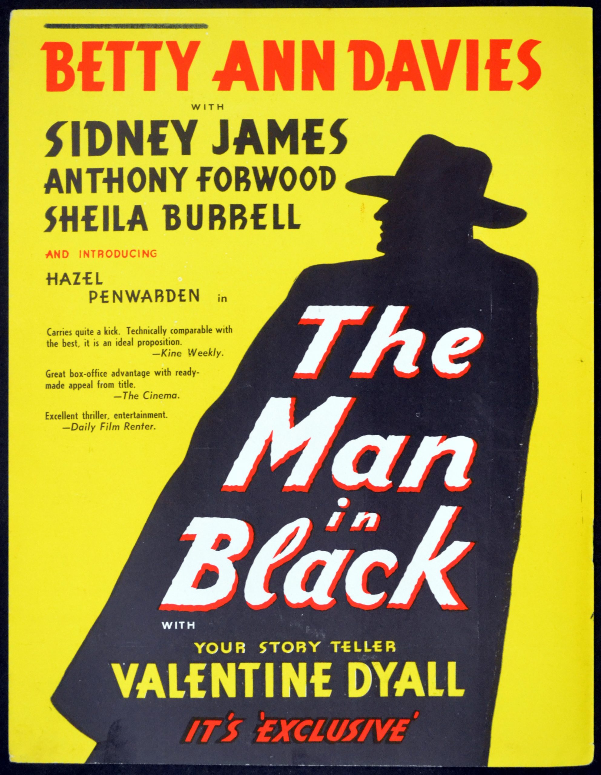 Original British 11 inch x 8 1/2 inch Trade Advertisement from Kinematograph Weekly for the 1950 Francis Searle Hammer Film Productions Thriller THE MAN IN BLACK, based on the radio series ‘Appointment with Fear’ by John Dickson Carr and starring Betty Ann Davies, Sidney James, Anthony Forwood, Sheila Burrell, Hazel Penwarden and the story teller Valentine Dyall.