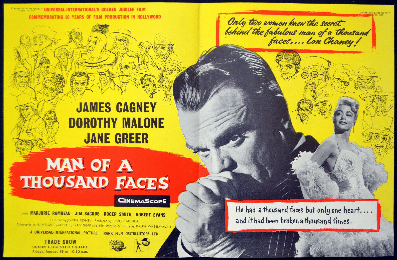 Original British 17 inch x 11 inch Trade Advertisement from Kinematograph Weekly for the 1957 Joseph Pevney Biographical Drama MAN OF A THOUSAND FACES, based on a story by by Ralph Wheelwright and starring James Cagney, Dorothy Malone, Jane Greer, Marjorie Rambeau, Jim Backus, Roger Smith, Robert Evans and Carol Morris.