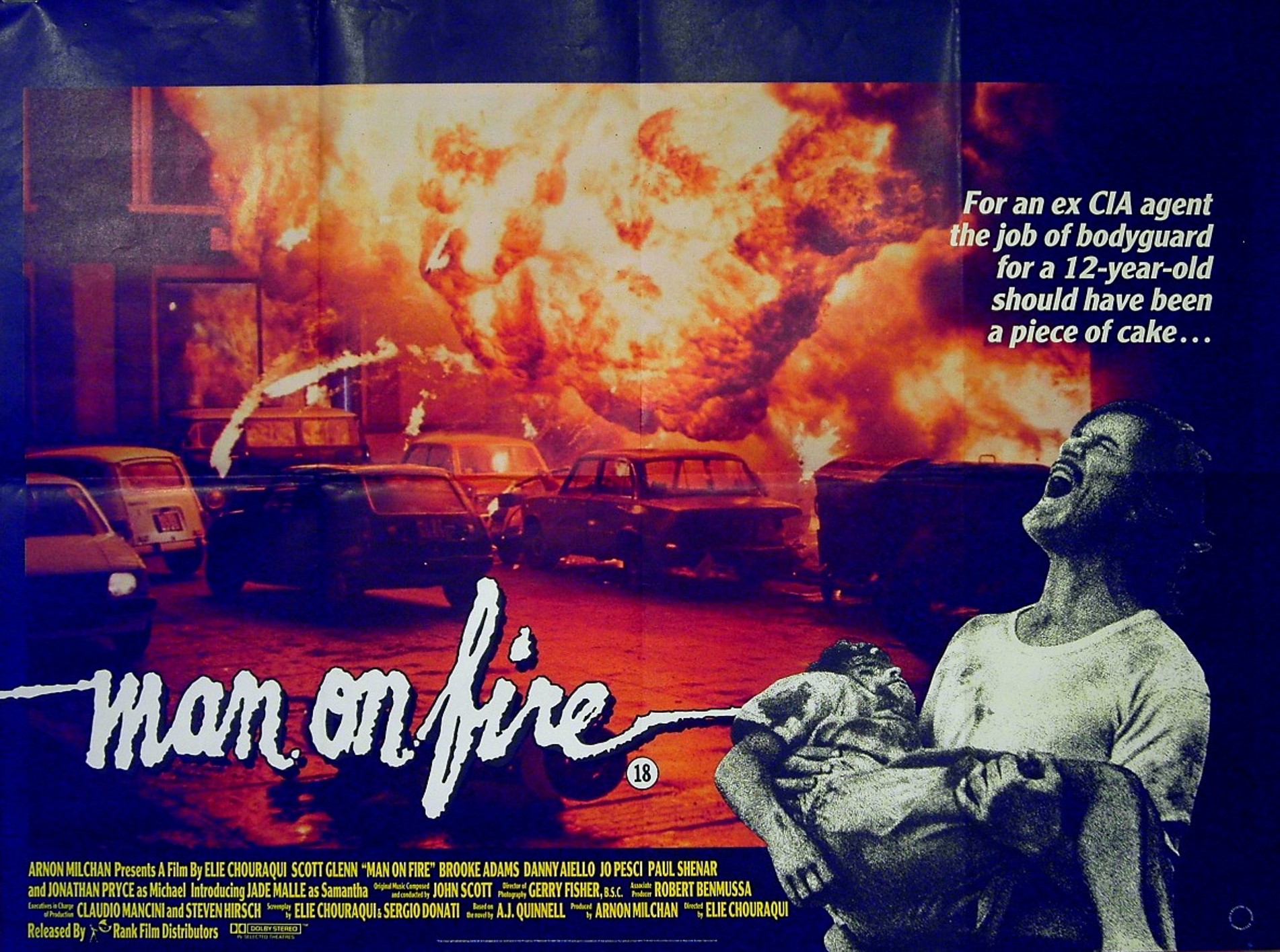 Original British 30 inch x 40 inch Quad Poster for the 1987 Elie Chouraqui Thriller MAN ON FIRE starring Scott Glenn, Jade Malle, Joe Pesci, Brooke Adams, Jonathan Pryce and Danny Aiello.